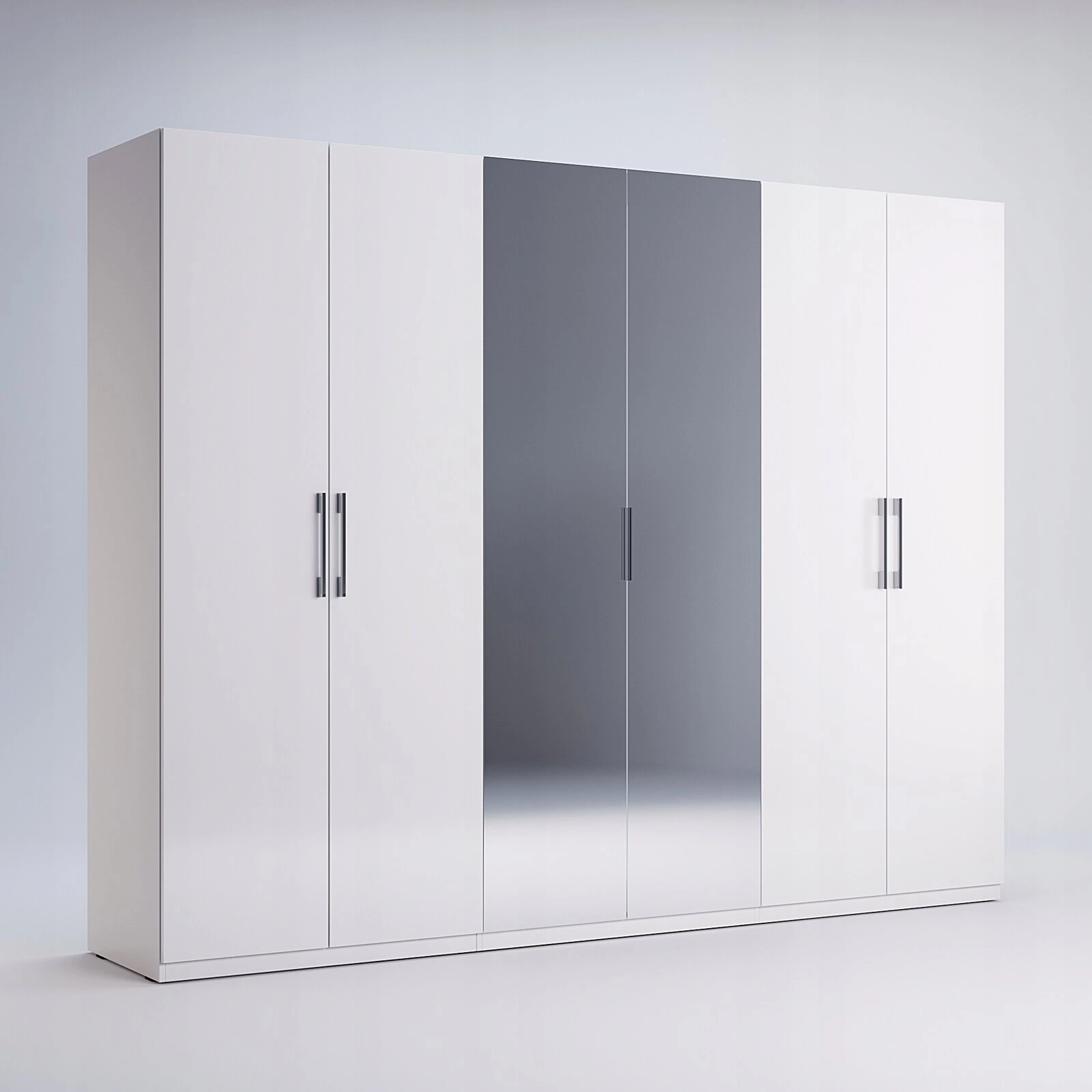 Szafa Flory to nowoczesna, 6-drzwiowa szafa z lustrem w białym połysku, zaprojektowana z myślą o sypialni lub garderobie. Jej imponujące wymiary – wysokość 210 cm, szerokość 268 cm oraz głębokość 55 cm – gwarantują przestronność, a pojemne półki i praktyczny drążek pozwalają na wygodne przechowywanie zarówno ubrań wiszących, jak i składanych. Błyszczące, gładkie fronty w odcieniu czystej bieli nie tylko powiększają optycznie wnętrze, ale podkreślają jego elegancki, nowoczesny styl.