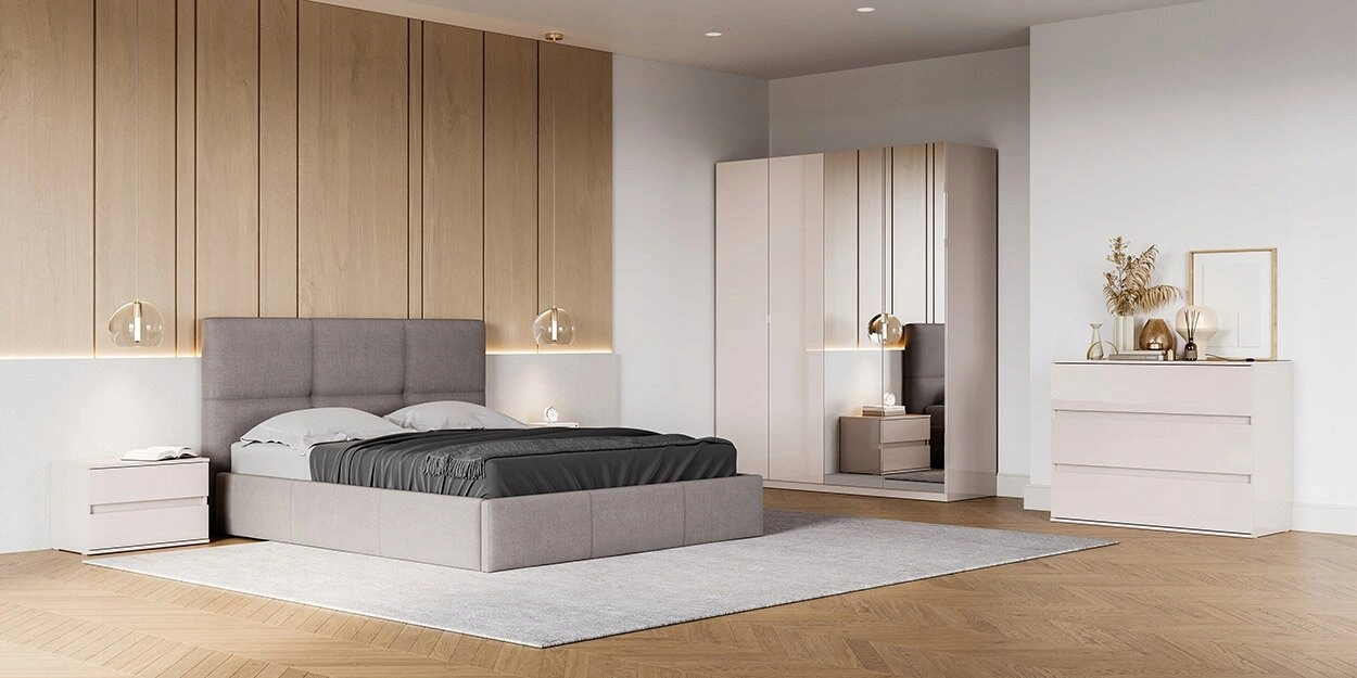 - Neutralna biel – łatwa do zestawienia z innymi meblami w sypialni lub garderobie