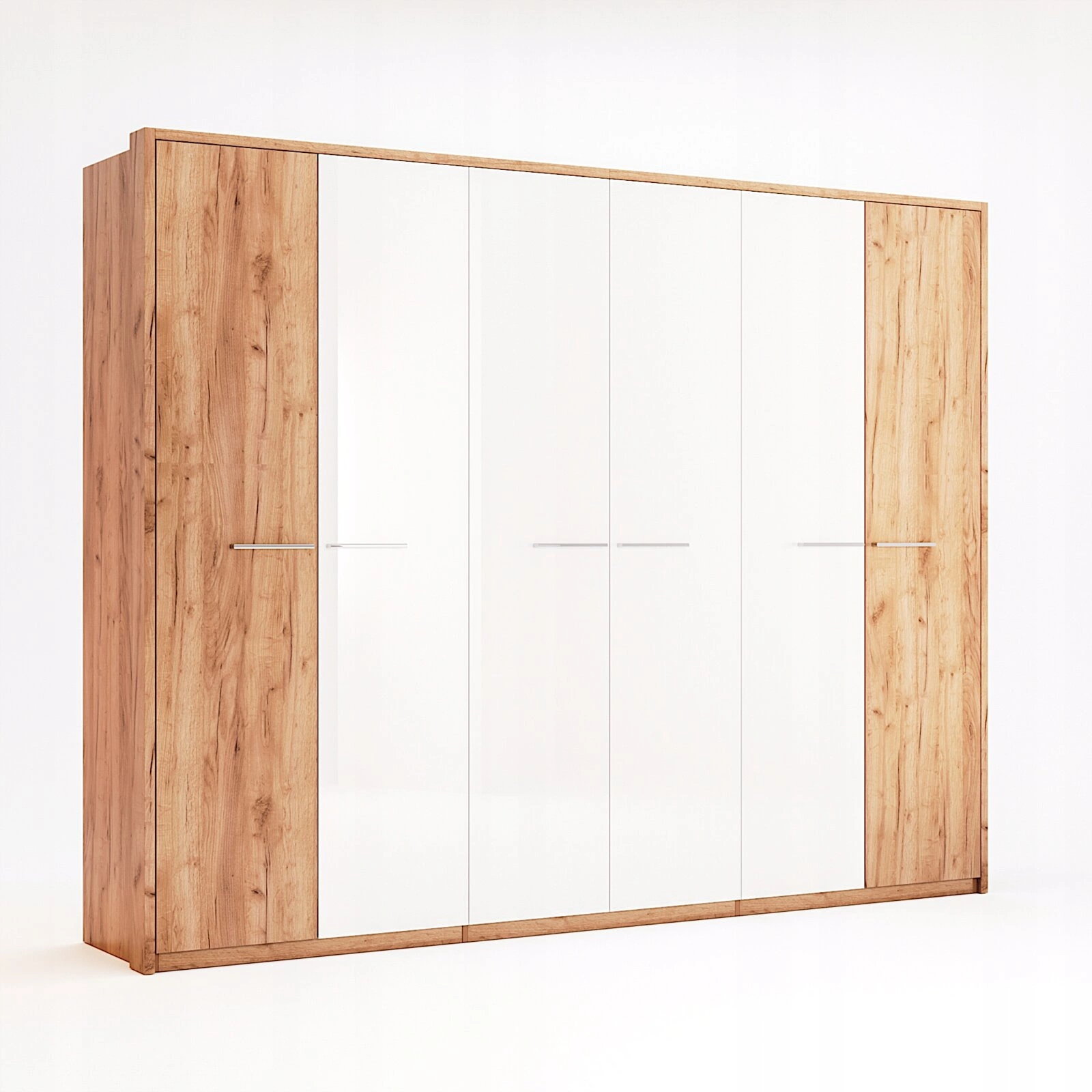 Szafa Madera 6-drzwiowa zachwyca połączeniem naturalnego dębu i białych frontów z gładkim wykończeniem na wysoki połysk. Ten kontrast sprawia, że mebel staje się efektowną ozdobą każdej sypialni urządzonej w stylu skandynawskim. Przemyślana, prosta forma oraz wyważone proporcje czynią tę szafę uniwersalnym wyborem do nowoczesnych wnętrz, gdzie liczy się zarówno estetyka, jak i praktyczność.