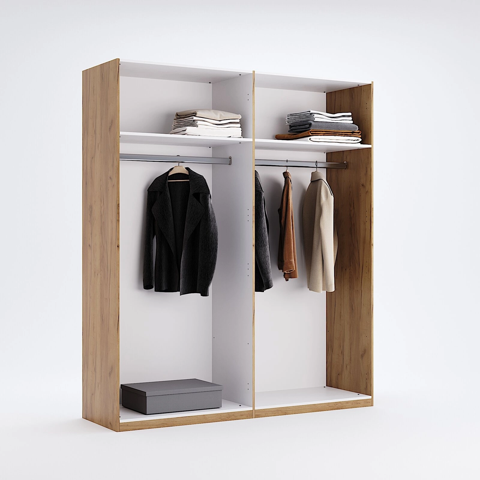 Wnętrze szafy zostało zaprojektowane tak, aby maksymalnie ułatwić segregację ubrań, pościeli czy sezonowych dodatków. Przemyślany układ półek pozwala na wygodne przechowywanie różnych kategorii odzieży, a szerokość 200 cm umożliwia wygodne rozmieszczenie wszystkich elementów garderoby. Dzięki głębokości 61 cm bez trudu zmieścisz w niej nawet duże ubrania czy pojemniki z akcesoriami.
