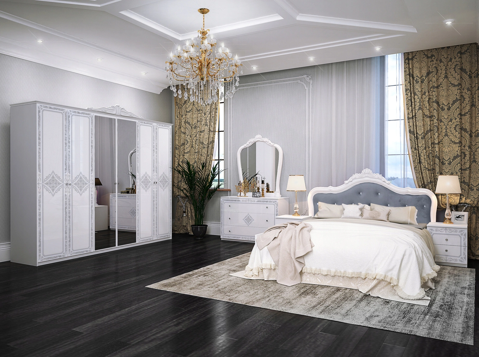 Szafa Diamante z lustrem o szerokości 281 cm to nowoczesny mebel w eleganckim, białym połysku, zaprojektowany z myślą o maksymalnej funkcjonalności w sypialni lub garderobie. Model wyróżnia się dużą pojemnością, trzema praktycznymi półkami oraz przestronnym lustrem na froncie, które optycznie powiększa wnętrze i ułatwia codzienne przygotowania. Błyszczące fronty gładkie, wykonane z trwałej płyty, nadają całości lekkości i nowoczesnego charakteru.