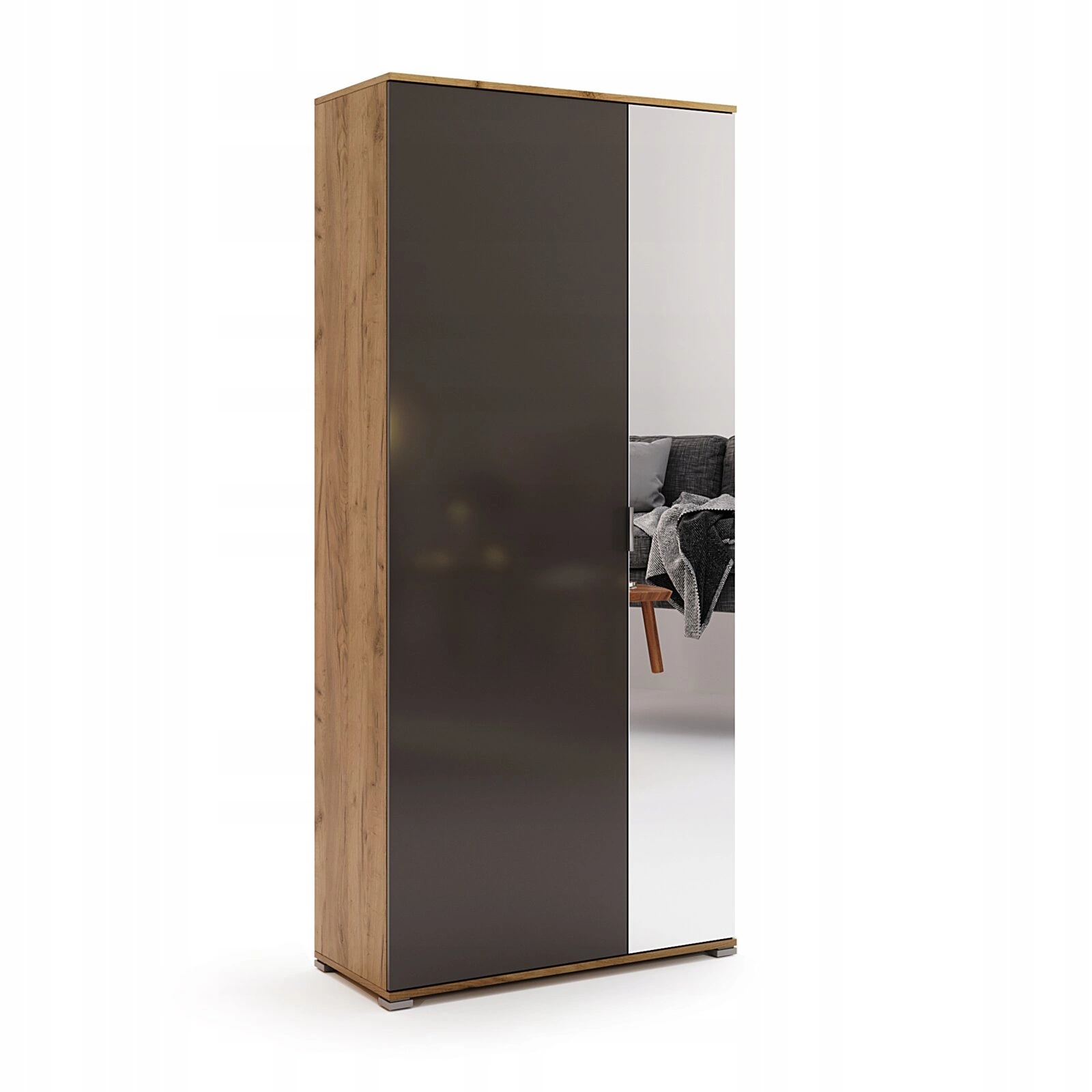 Szafa Lana doskonale wpisuje się w aktualne trendy aranżacyjne dzięki swojej prostocie i stonowanej kolorystyce. Połączenie naturalnego odcienia dębu z matową szarością sprawia, że mebel wprowadza do wnętrza spokój oraz przytulność. Gładkie fronty w delikatnym połysku subtelnie odbijają światło, optycznie powiększając przestrzeń i podkreślając elegancki, skandynawski styl.