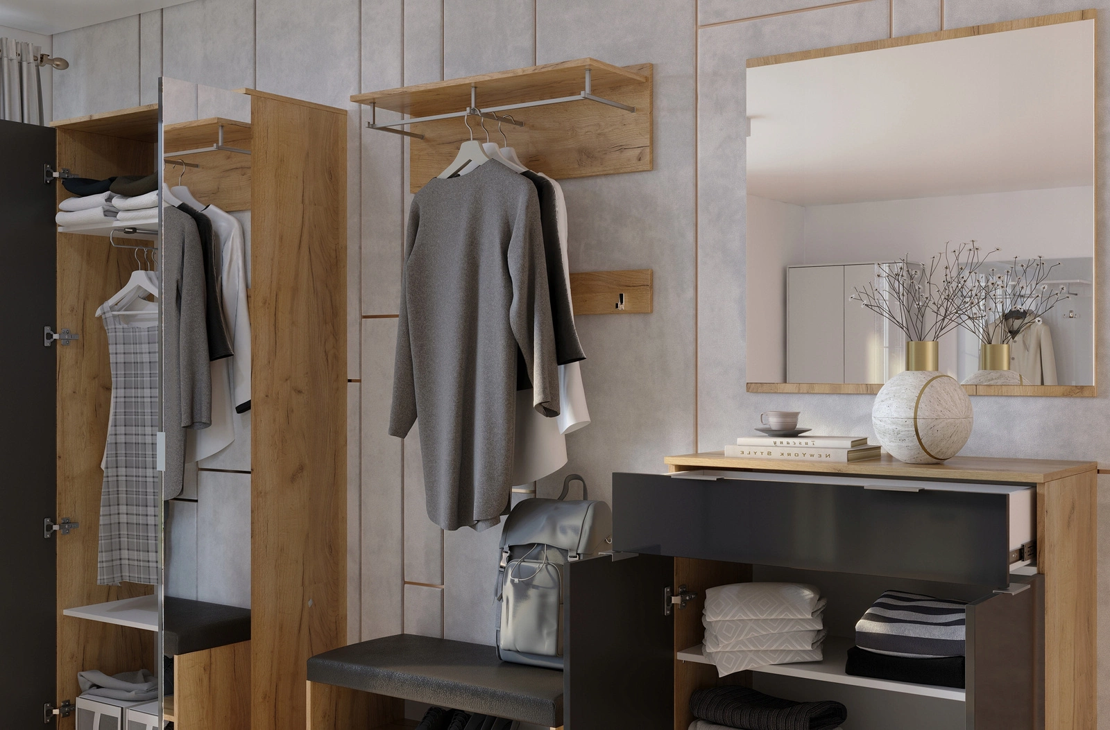- Półki i drążek – wygodna segregacja ubrań i szybki dostęp do potrzebnych rzeczy