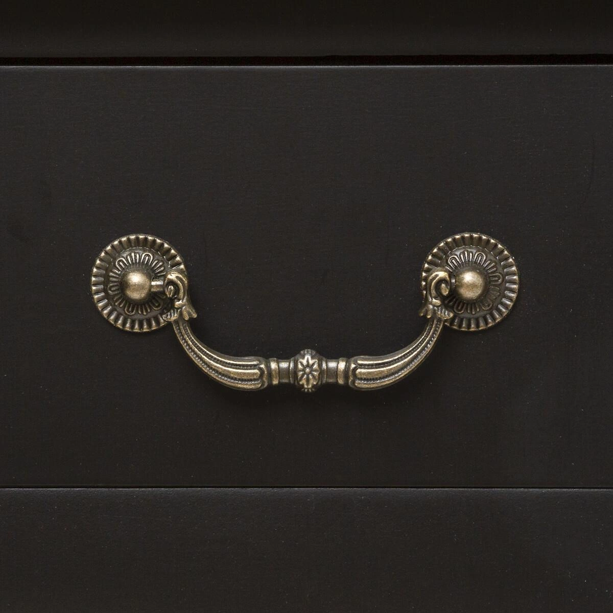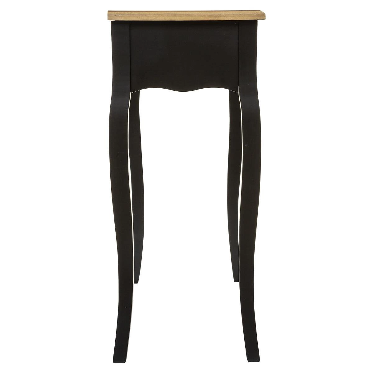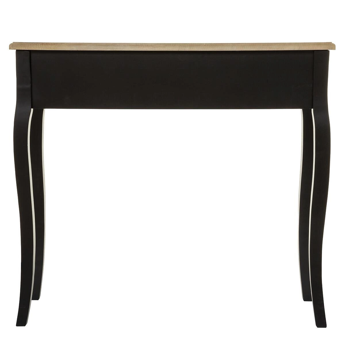 Konsola Chrysa to czarny mebel z blatem z naturalnego drewna. Podstawa to dwie sosnowe nogi o nietypowym kształcie. Chrysa wyposażona jest w dwie szuflady ze stylowymi, metalowymi uchwytami, które ułatwiają dostęp do szuflad. Korpus konsoli oraz blat wykonany jest z płyty MDF.
