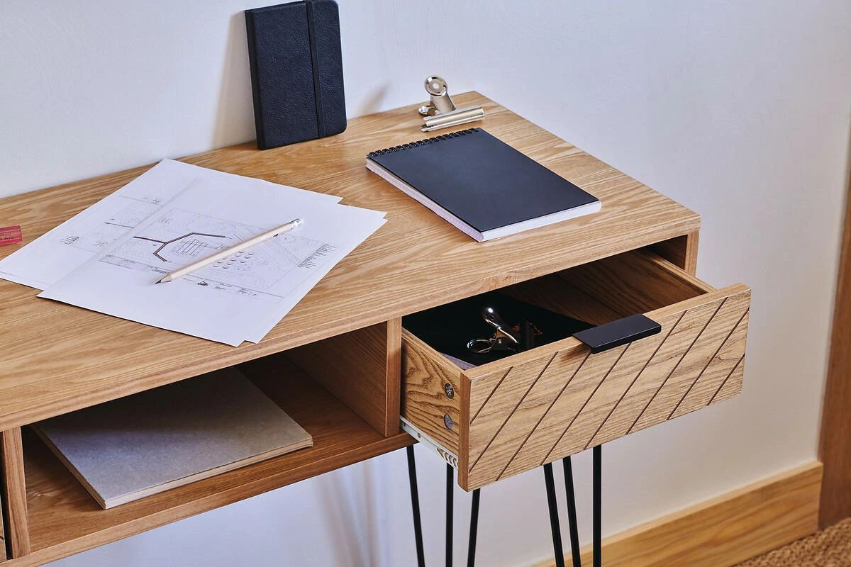 Konsola Naomi charakteryzuje się frontami w jodełkę oraz czarnymi, metalowymi nogami oraz uchwytami. Konsola z dwoma szufladami sprawdzi się w nowoczesnej sypialni, przedpokoju lub pokoju nastolatka. Ciekawy mebel w stylu loftowym pomieści nie tylko klucze, czy telefon. Konsola w połączeniu z dużym lustrem będzie ciekawym elementem wystroju wnętrza..