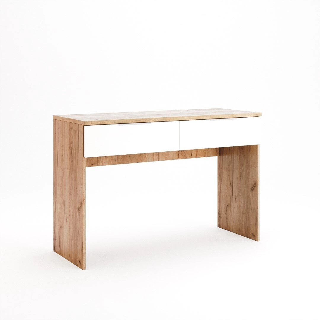 Toaletka Tissa marki Intesi to nowoczesna toaletka do sypialni o szerokości 120 cm, wykończona w eleganckim połysku, łącząca ciepły odcień dębu craft z bielą. Wyróżnia się dwoma praktycznymi szufladami oraz prostokątnym, przestronnym blatem, który zapewnia komfortowe miejsce do codziennego makijażu i pielęgnacji. Stylowy design oraz łatwość czyszczenia sprawiają, że toaletka doskonale odnajdzie się zarówno w sypialni, garderobie, jak i pokoju młodzieżowym.
