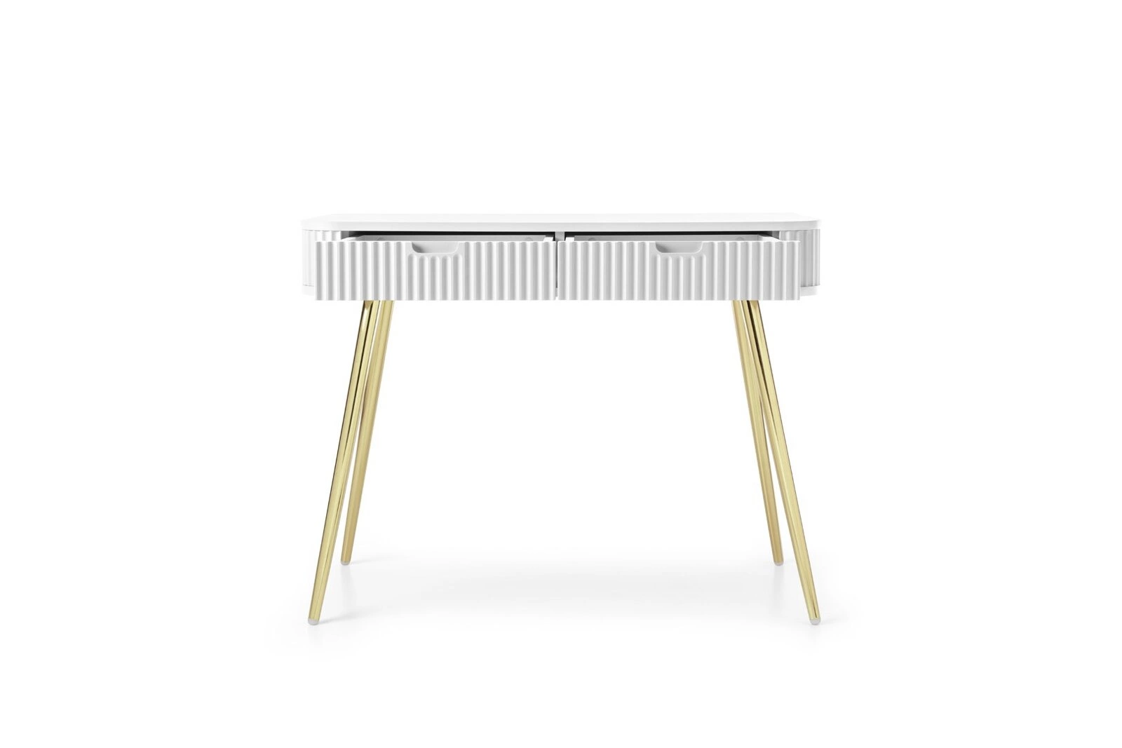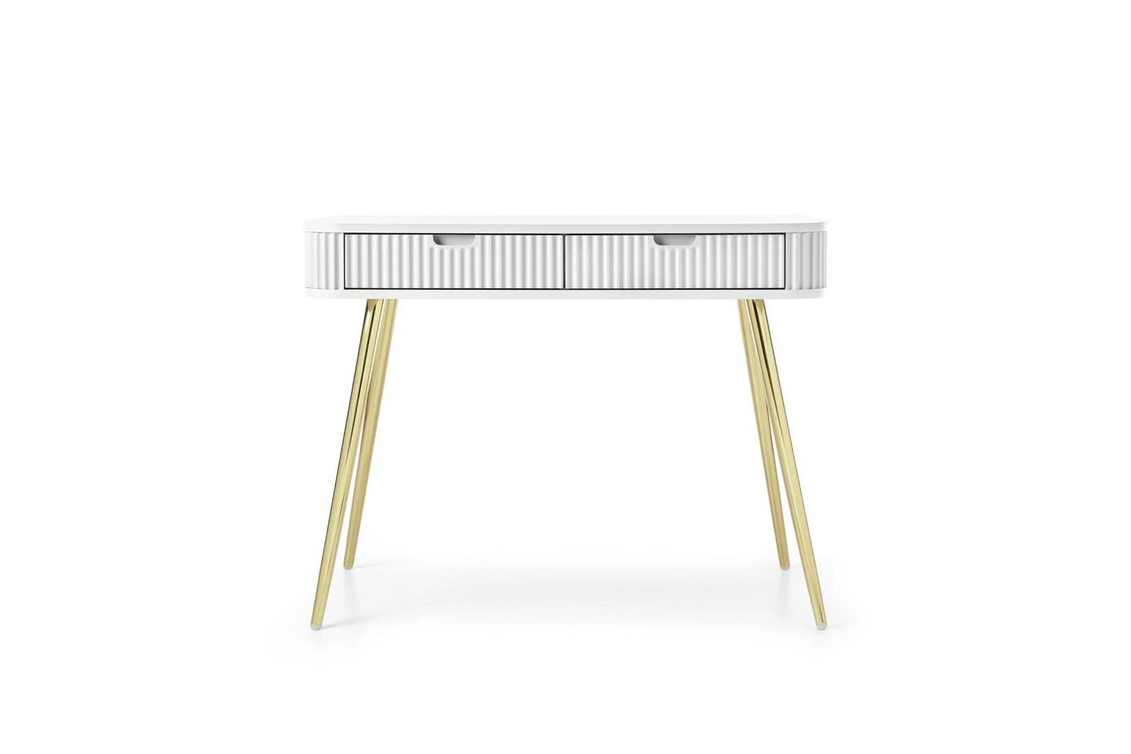 - Biała kolorystyka i złote nogi nadają toaletce nowoczesny i luksusowy wygląd, idealny do modnych przedpokojów