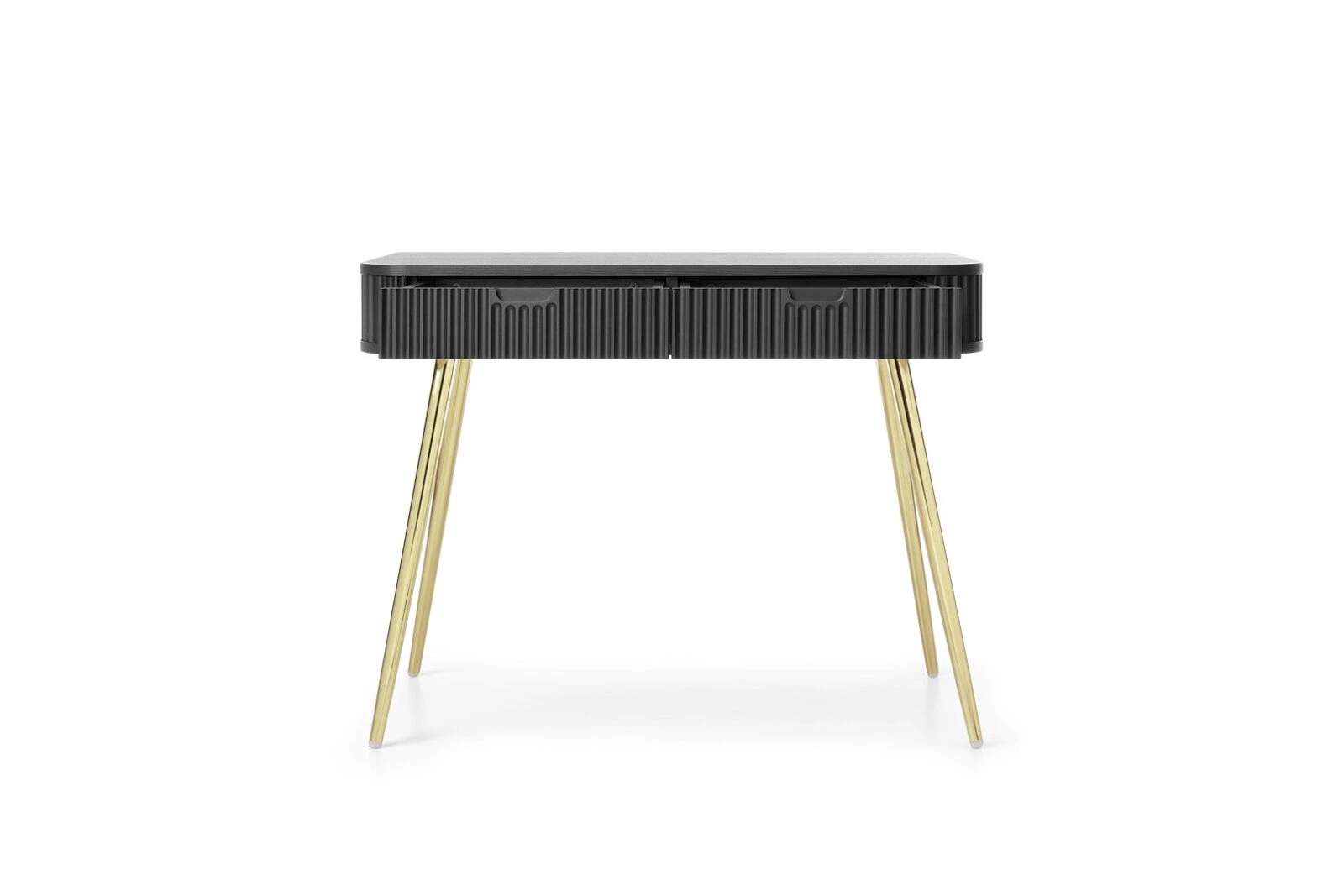 - Czarna kolorystyka i złote nogi nadają toaletce nowoczesny i luksusowy wygląd, idealny do modnych przedpokojów