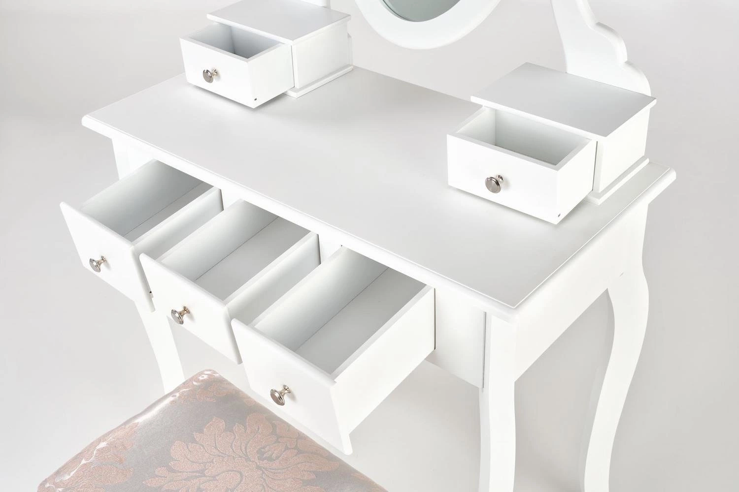Jedną z największych zalet tej toaletki jest jej funkcjonalność. Posiada wiele schowków i półek, które pomogą Ci utrzymać porządek w swoich kosmetykach i akcesoriach do makijażu. Dzięki temu wszystko będzie zawsze na swoim miejscu, a Ty będziesz mieć łatwy dostęp do wszystkich potrzebnych rzeczy. Dodatkowo, toaletka ze stołkiem Elsa zapewnia wygodne miejsce do siedzenia podczas wykonywania makijażu czy układania fryzury.