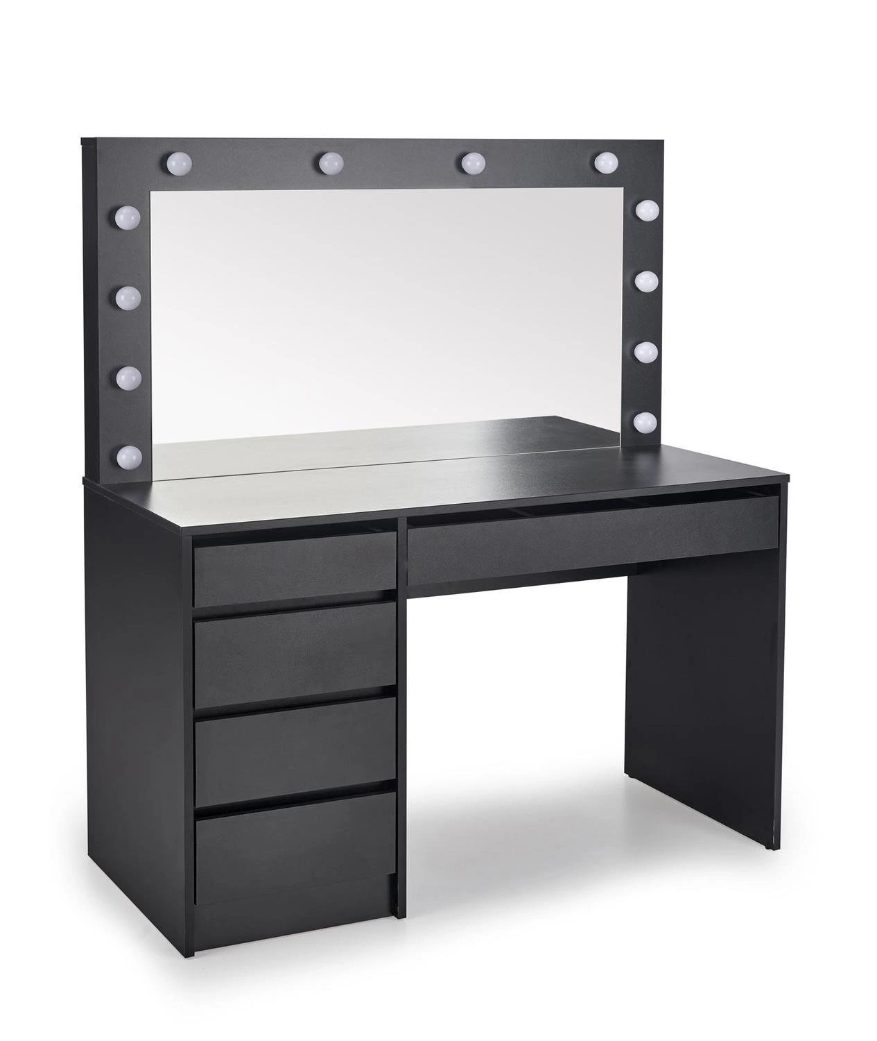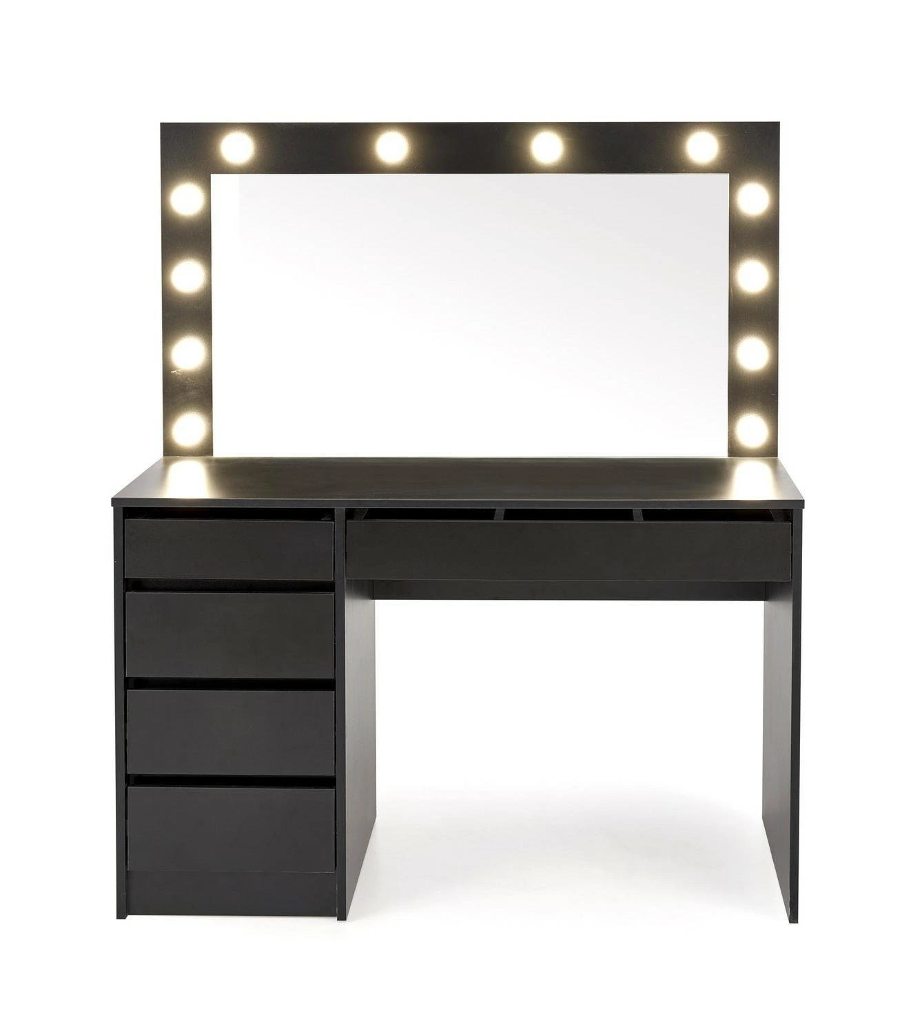 Toaletka z lustrem Sybilla XL czarna | Intesi Elegancka toaletka to idealne rozwiązanie dla tych, którzy pragną połączyć funkcjonalność z estetyką. Jej wymiary, wynoszące 120 cm szerokości, 55 cm głębokości i 140 cm wysokości, zapewniają odpowiednią przestrzeń do codziennej pielęgnacji. Wykonana z wysokiej jakości płyty meblowej okleinowanej w czarnym kolorze. Oświetlenie LED umieszczone na krawędzi lustra dostarcza doskonale rozproszone światło, dzięki czemu wykonywanie makijażu czy golenie staje się prostsze i bardziej precyzyjne. Pięć pojemnych szuflad pozwala na przechowywanie kosmetyków i innych niezbędnych przedmiotów, utrzymując porządek wokół toaletki. Toaletka Sybilla to nie tylko mebel praktyczny, ale również stanowi designerską ozdobę w każdej sypialni czy łazience. Jej harmonijny wygląd oraz funkcjonalność sprawiają, że staje się ona niezastąpionym elementem każdego domowego wnętrza, spełniając oczekiwania nawet najbardziej wymagających użytkowników. O tym warto pamiętać! Jest to mebel przeznaczony do codziennej pielęgnacji, zintegrowany z lustrem, który ułatwia wykonywanie makijażu, golenia czy układania fryzury. Na krawędzi lustra zainstalowano oświetlenie LED, które zapewnia równomierne i miękkie światło. Mebel posiada pięć szuflad, które oferują wystarczającą pojemność na przechowywanie kosmetyków, akcesoriów do pielęgnacji oraz innych niezbędnych przedmiotów. W toaletce znajduje się duże lustro, które pełni zarówno funkcję użytkową, jak i dekoracyjną, odbijając światło i powiększając optycznie przestrzeń.