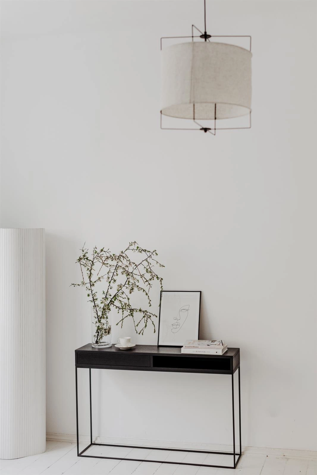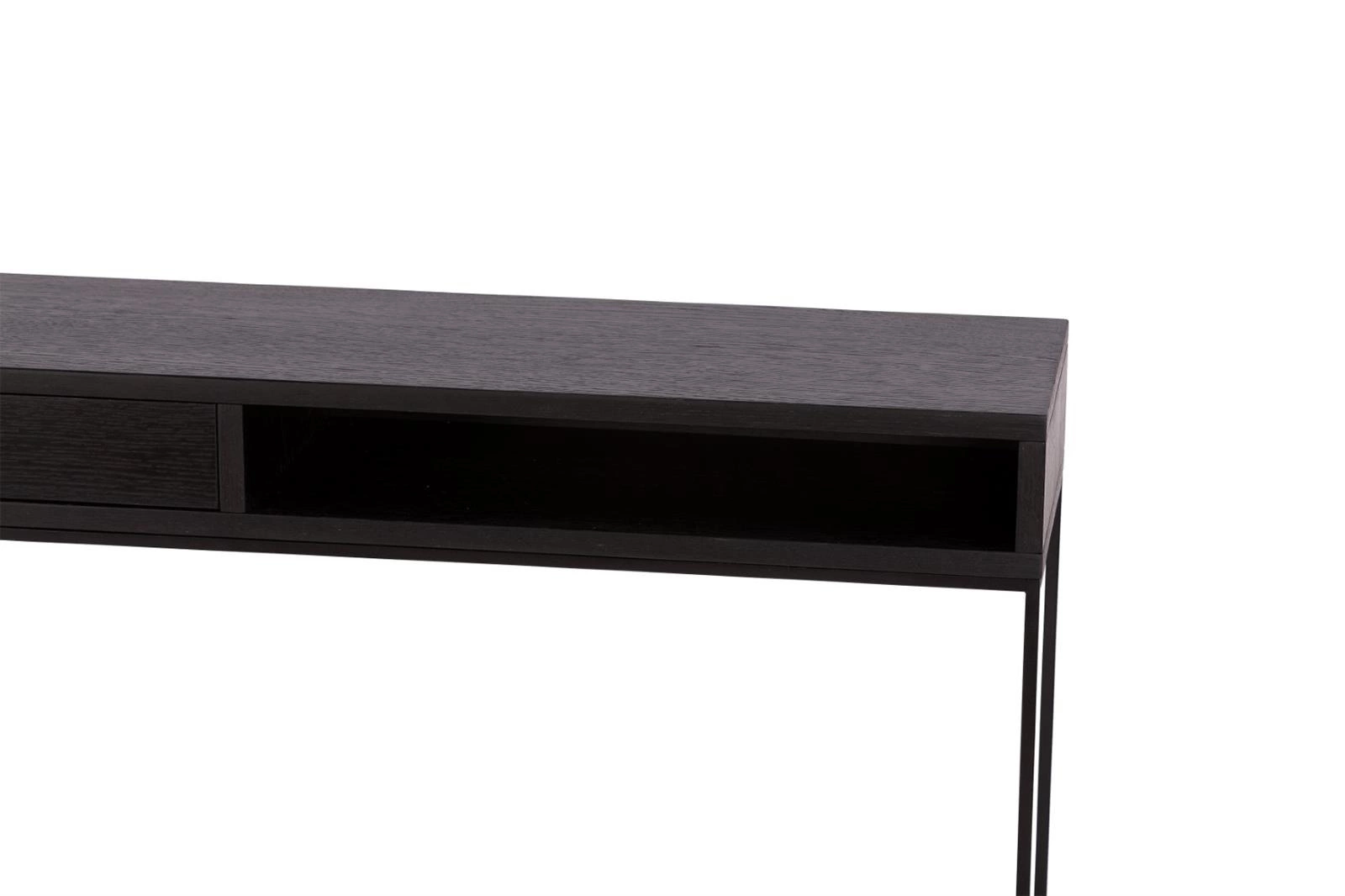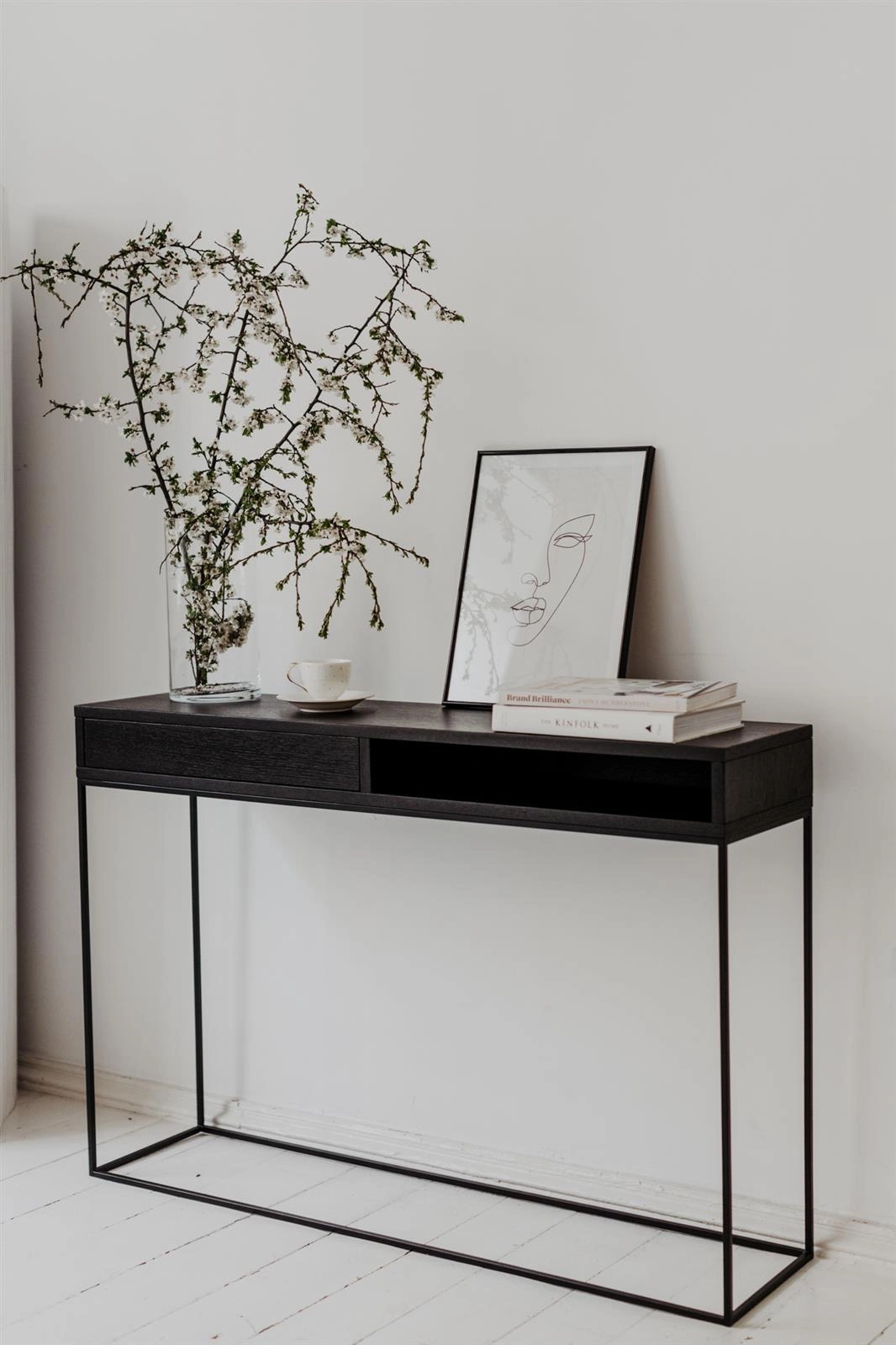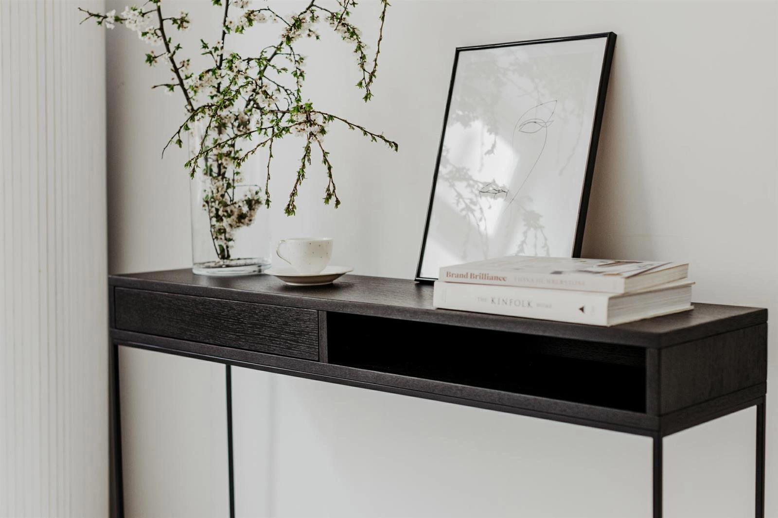 Korpus i fronty konsoli wykonane zostały z płyty wiórowej 18 mm. STAM posiada jedną szufladę zakrytą i jedną półkę odkrytą, na której można położyć swoje ulubione książki. Szuflada otwiera się na kliknięcie. Dzięki takiemu rozwiązaniu mebel zyskuje na elegancji. Na blacie konsoli pięknie będą się prezentowały kwiaty w wazonie, obraz czy książki. Ciekawym elementem są metalowe nogi proszkowane na czarno, które zapewniają całej konstrukcji stabilność. Mebel wymaga samodzielnego montażu.