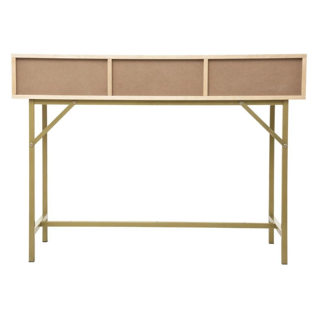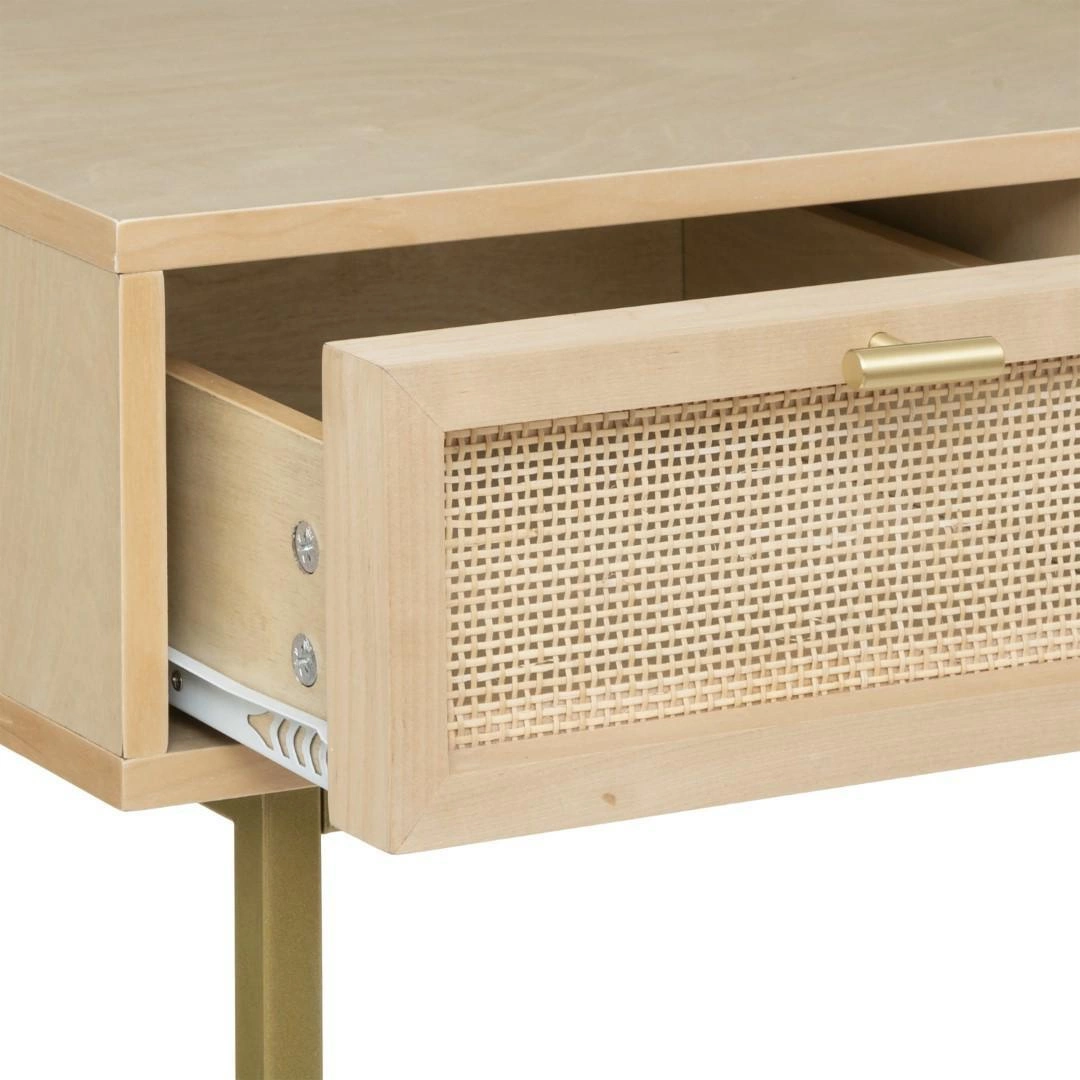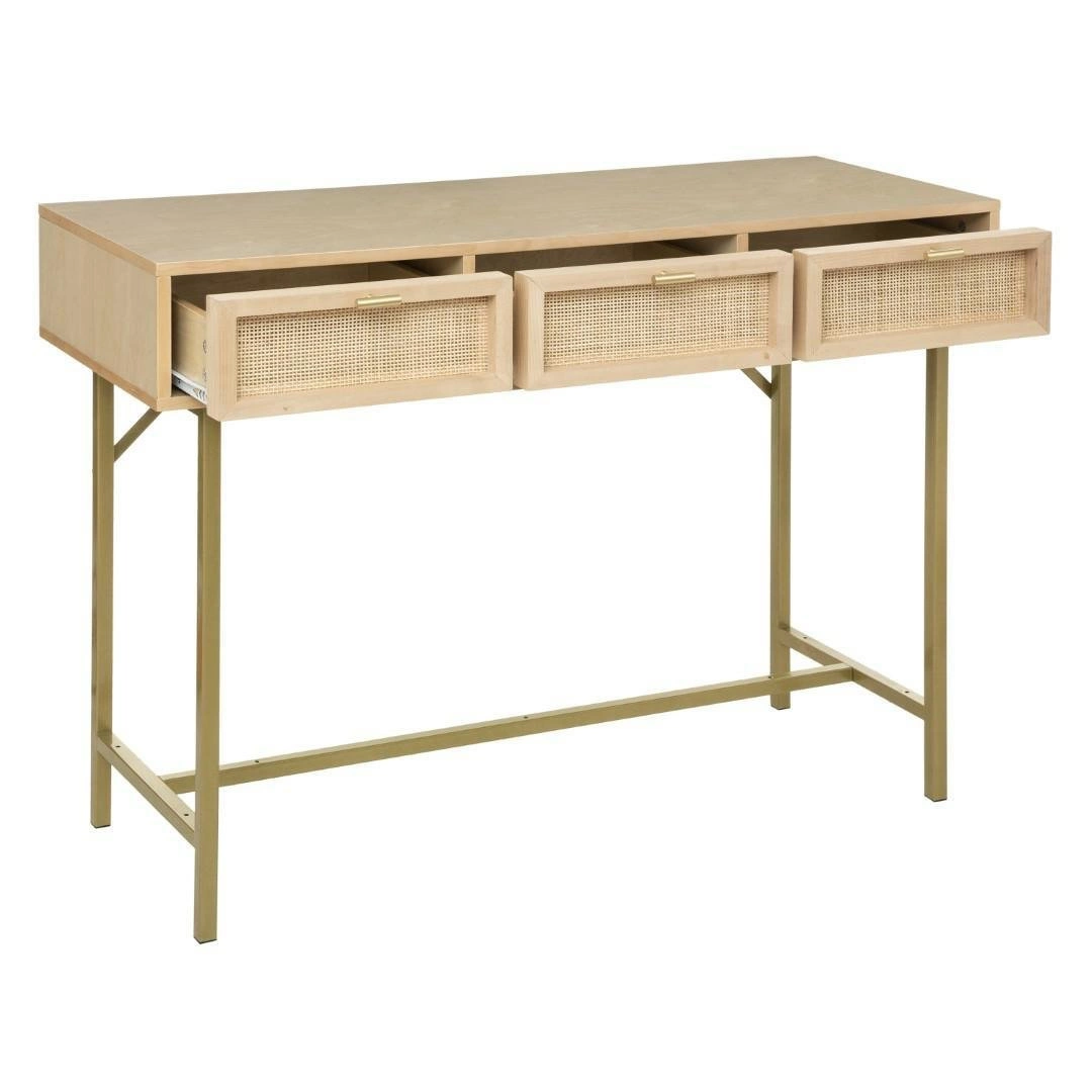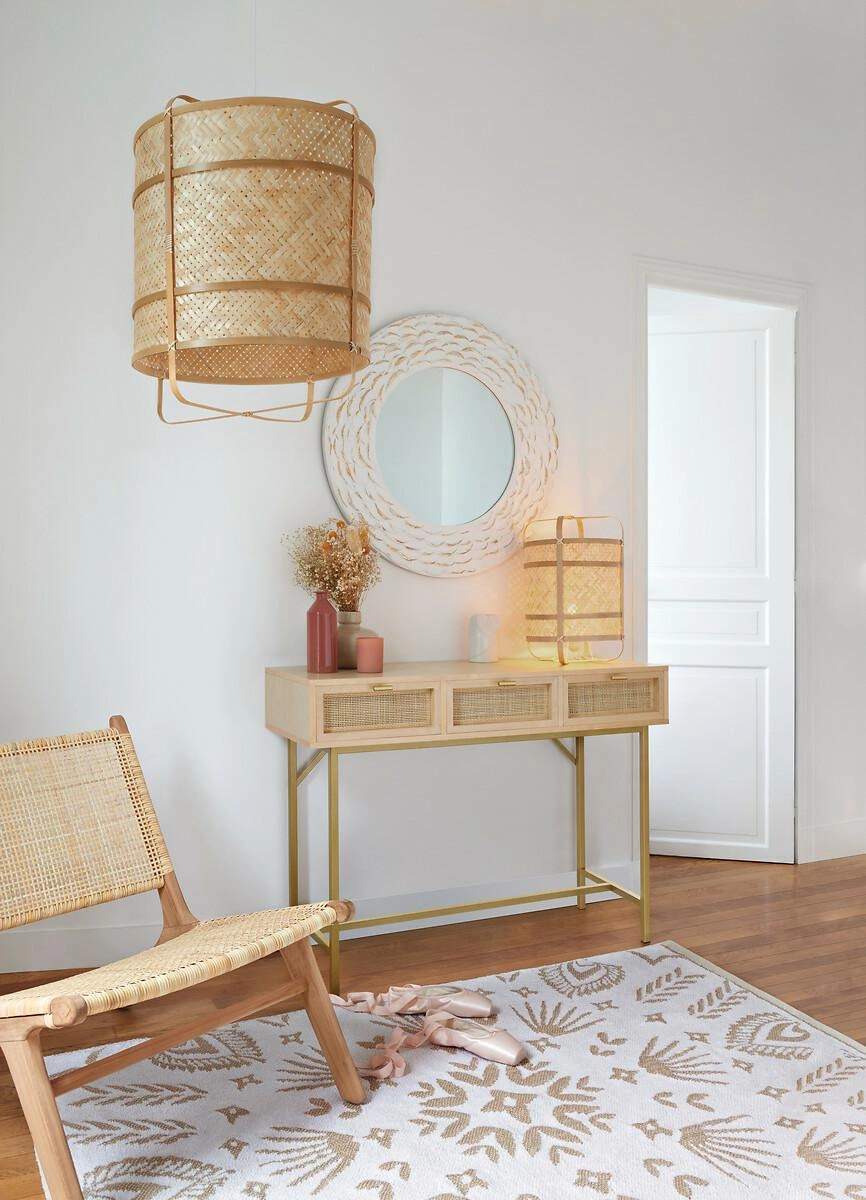 Konsola z rattanowymi frontami szuflad to mebel wykonany w stylu Boho. Charakteryzuje się on wykonaniem z naturalnych materiałów i bliskim kontakcie z naturą. Plecionka z rattanu umieszczona została w drewnianych- brzozowych frontach szuflad, dodając meblowi wizualnej lekkości. Zaletą Rayo są trzy pakowne szuflady, które pomogą ci uporządkować kosmetyki do makijażu czy do pielęgnacji. Nogi konsoli oraz uchwyty zostały wykonane z metalu, pomalowanego na złoty kolor. Stanowią one subtelną dekorację, która nie zakłóca klasycznej i minimalistycznej stylistyki mebla. Korpus konsoli to niezwykle wytrzymała płyta meblowa, w okleinie imitującej drewno. Rayo o naturalnych barwach optycznie ociepli twoją przestrzeń. Ten urokliwy produkt z pewnością zawróci w głowie niejednej osobie. Jeśli chcesz w jednolity sposób urządzić swoje mieszkanie postaw na inne meble z tej samej serii!