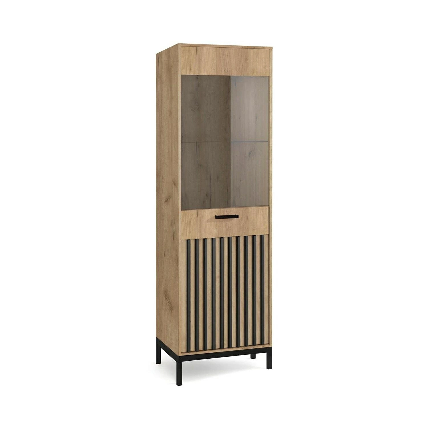Witryna Markle to elegancka propozycja, która wprowadza do wnętrza harmonijną elegancję i funkcjonalność. Wykonana z wysokiej jakości płyty laminowanej w ciepłym odcieniu dębu craft, witryna emanuje naturalnym pięknem i ciepłem, które doskonale wpisuje się w różnorodne aranżacje wnętrz. Czarny akcent w postaci lameli na frontach mebla dodaje nowoczesnego twistu, tworząc unikalny kontrast z drewnianym wykończeniem i nadając witrynie wyjątkowego charakteru.
