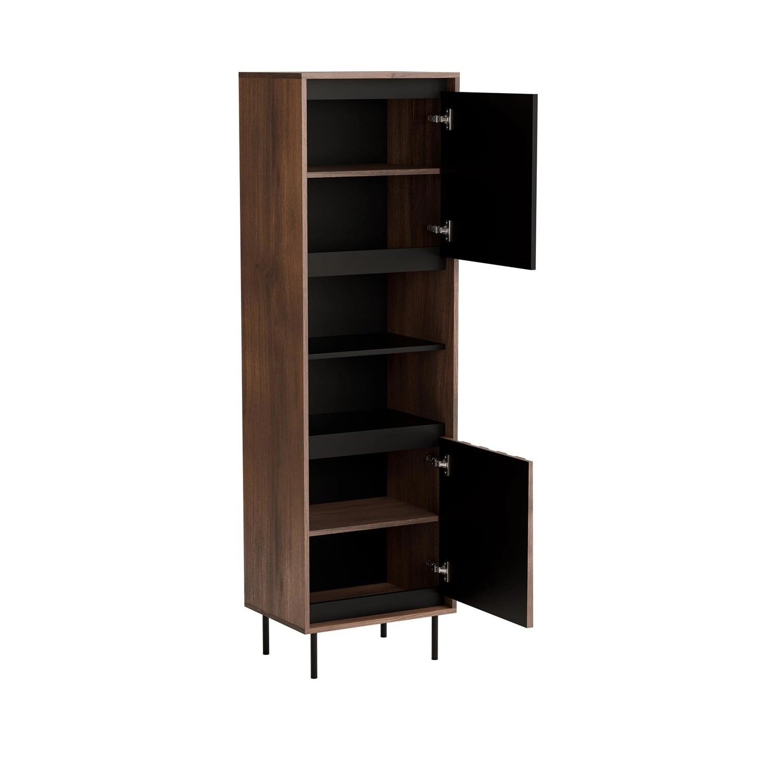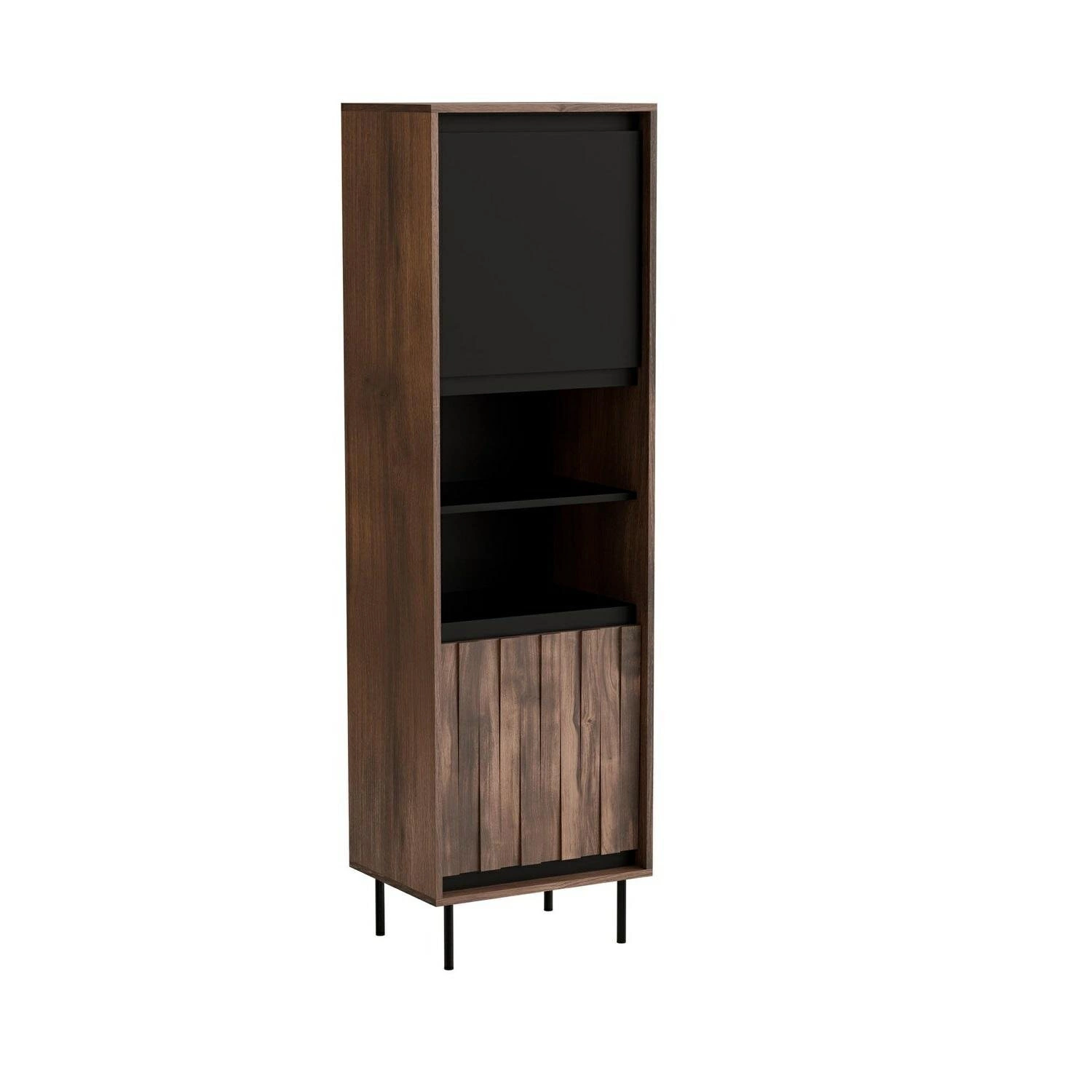 Czarny akcent w postaci stalowych, malowanych proszkowo elementów dodaje meblowi nowoczesnego sznytu, który doskonale komponuje się z ciepłym odcieniem orzecha. Dzięki swojej wszechstronności, witryna Miri pasuje zarówno do wnętrz urządzonych w stylu klasycznym, jak i nowoczesnym, wnosząc do nich elegancję i szyk. To więcej niż tylko mebel – to prawdziwa ozdoba, która nadaje wnętrzu wyjątkowego charakteru.