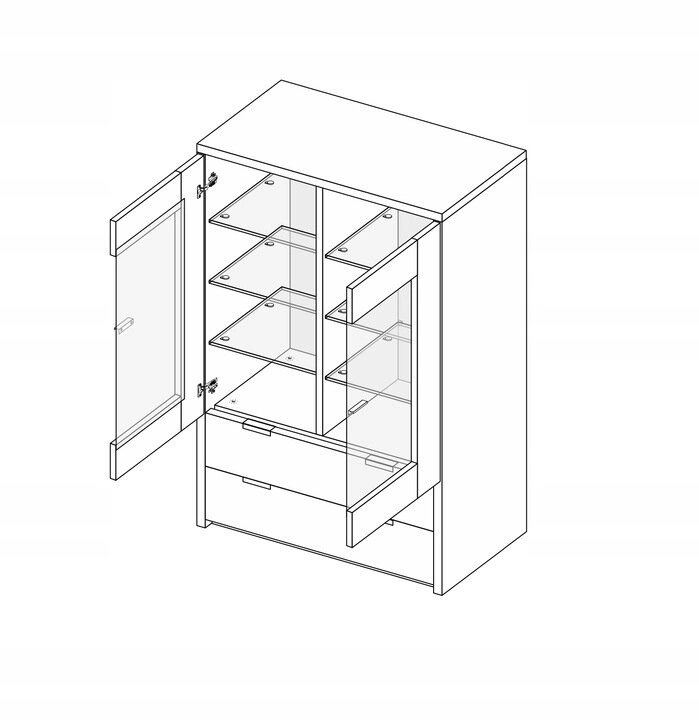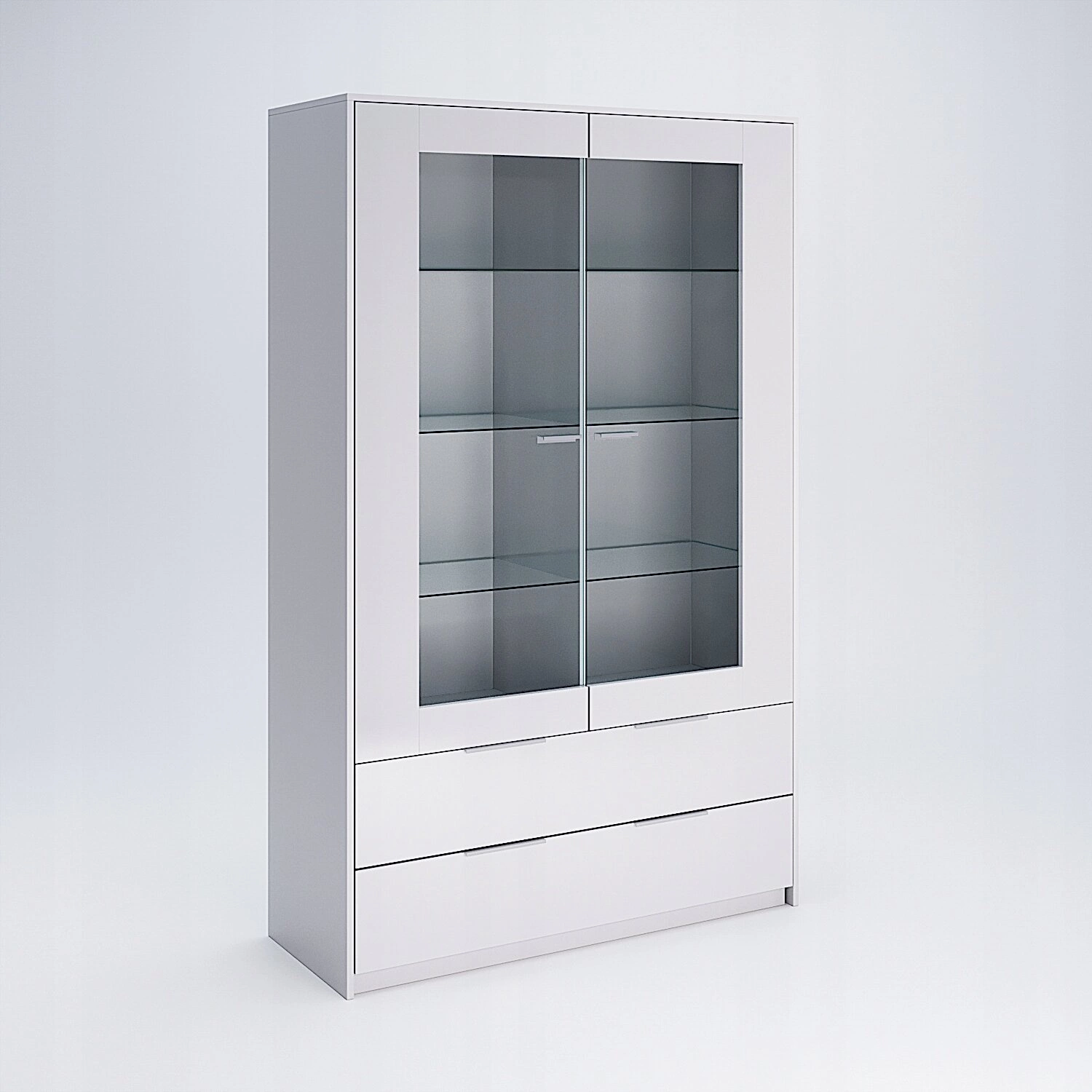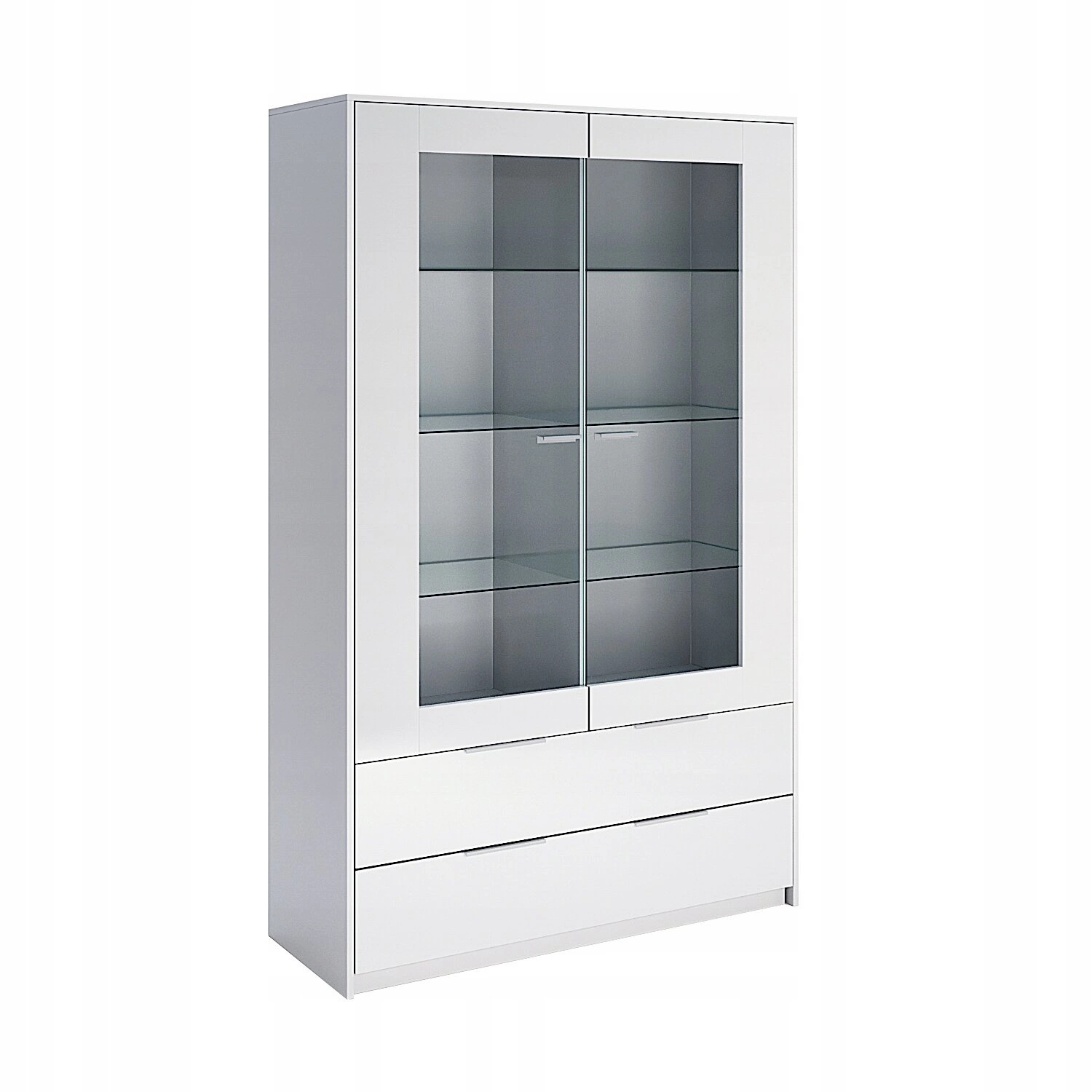 Witryna Merle szklana to propozycja dla osób, które cenią sobie minimalistyczny styl i uporządkowaną przestrzeń. Dzięki uniwersalnej bieli w połysku oraz gładkim, przeszklonym frontom, mebel rozświetli nawet niewielkie pomieszczenie i optycznie je powiększy. Sześć przestronnych półek zapewnia wiele miejsca na książki, kolekcje lub eleganckie dekoracje, a dwie szuflady ułatwiają przechowywanie drobiazgów, których nie chcesz eksponować.