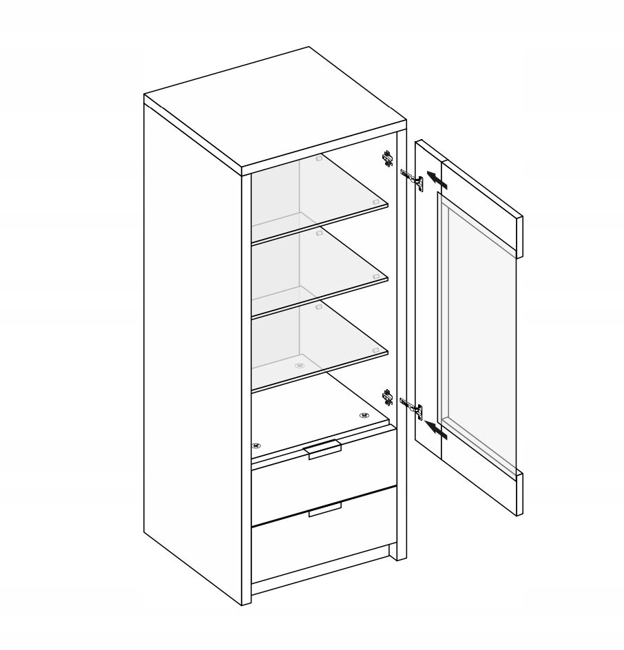 Witryna Merle została zaprojektowana z myślą o maksymalnej wygodzie użytkowania. Cztery pojemne półki umożliwiają uporządkowanie książek, kolekcji szklanek czy pamiątek rodzinnych, a dwie praktyczne szuflady sprawdzą się na drobne akcesoria lub dokumenty. Dodatkowa szafka na dole pozwala dyskretnie ukryć przedmioty, które nie muszą być na widoku. Lewostronne otwieranie drzwi podnosi komfort użytkowania, szczególnie w mniejszych pomieszczeniach, gdzie liczy się każdy centymetr.