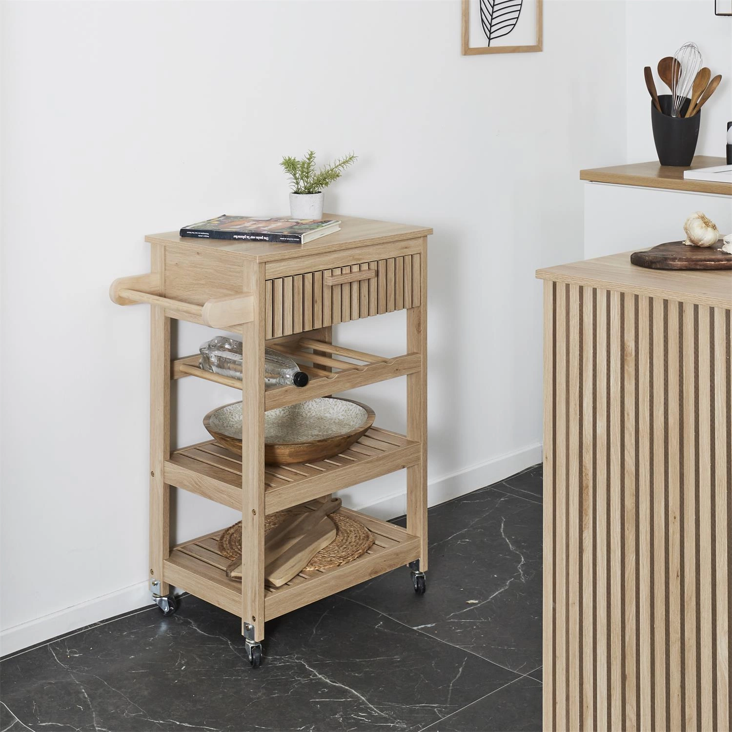 Naturalny kolor i pionowo frezowany front nadają wózkowi Klaus wyrazistego, przytulnego charakteru, który idealnie wpisuje się w skandynawskie aranżacje. Wózek nie tylko podkreśli nowoczesny wystrój kuchni czy jadalni, ale stanie się także praktycznym elementem wyposażenia – zarówno jako stolik mobilny do serwowania, jak i dodatkowa przestrzeń na produkty spożywcze, przybory kuchenne czy napoje.