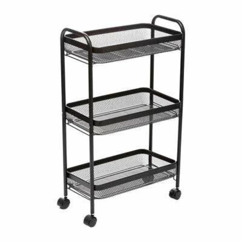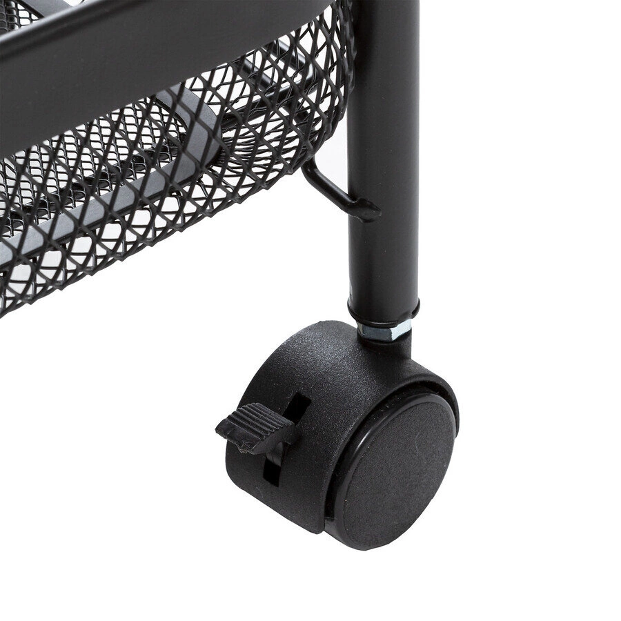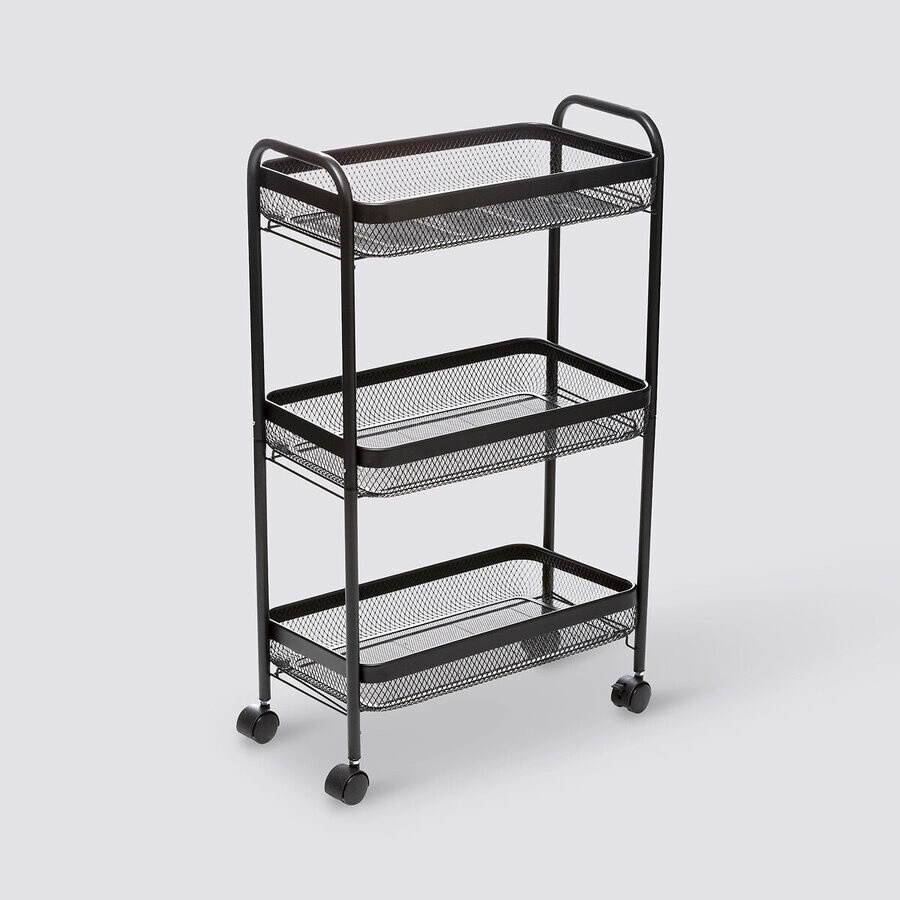 Mayaj metalowy wózek kuchenny na kółkach marki 5five simply smart to pojemny, prostokątny wózek do kuchni w kolorze czarnym, wykonany z wytrzymałego metalu. Dzięki trzem przestronnym półkom i mobilnej konstrukcji zapewnia wygodę przechowywania oraz łatwy dostęp do codziennych akcesoriów kuchennych. Kompaktowe wymiary – 79,6 cm wysokości, 46,5 cm szerokości i 26,5 cm głębokości – sprawiają, że idealnie sprawdzi się nawet w niewielkich przestrzeniach.