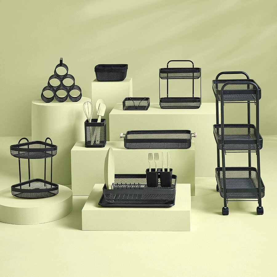 Wózek kuchenny Mayaj został zaprojektowany z myślą o maksymalnej funkcjonalności. Trzy poziome półki w formie metalowych koszyków umożliwiają przechowywanie owoców, warzyw, przypraw lub drobnego sprzętu kuchennego. Dzięki przemyślanemu układowi szybko uporządkujesz niezbędne produkty spożywcze, mając je zawsze pod ręką podczas gotowania. Wózek świetnie sprawdza się także jako pomocniczy stolik na kółkach podczas spotkań rodzinnych czy serwowania przekąsek.