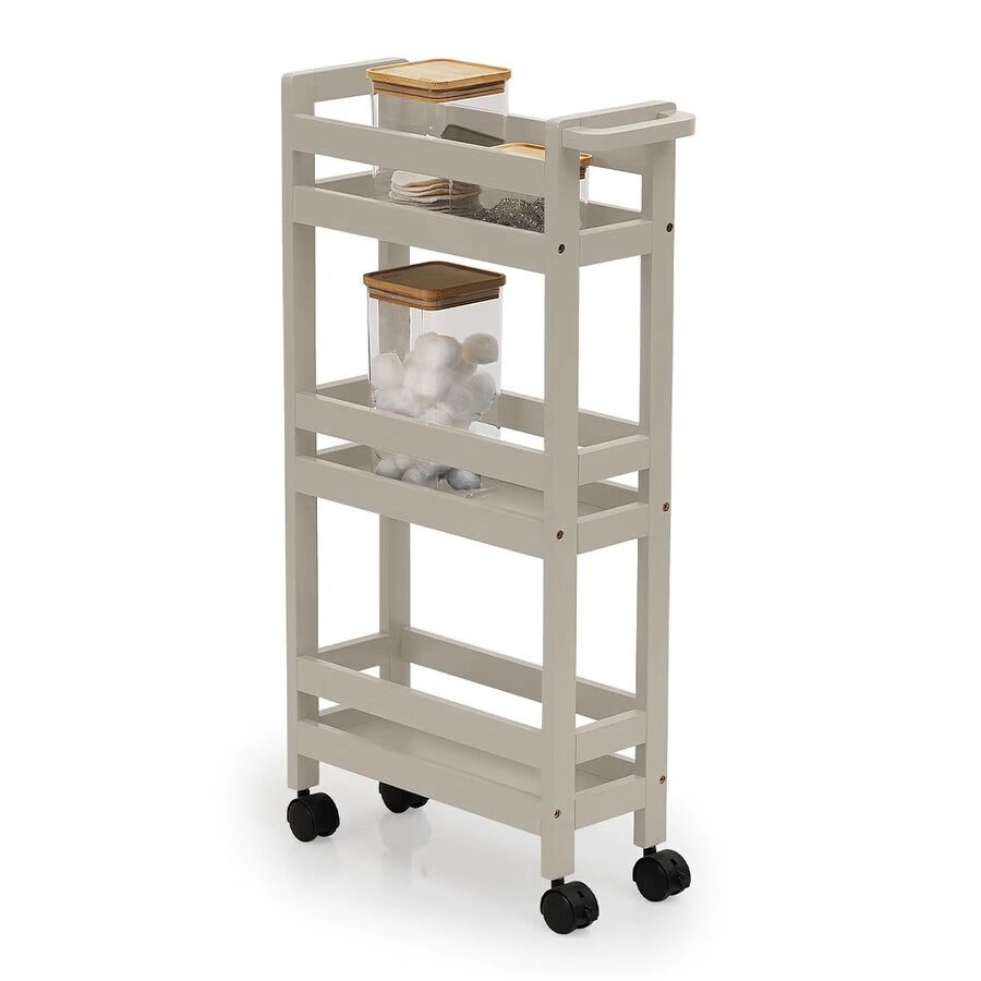 Wózek do przechowywania na kółkach Colors 3-poziomowy beżowy marki 5five simply smart to praktyczny i stylowy pomocnik zaprojektowany z myślą o codziennym komforcie. Został wykonany z trwałych materiałów – płyty MDF i tworzywa sztucznego – i oferuje aż trzy pojemne półki, które ułatwiają organizację przestrzeni w kuchni lub łazience. Dzięki kompaktowym wymiarom (szerokość 40 cm, głębokość 15 cm, wysokość 75 cm) wózek z łatwością zmieści się nawet w wąskich wnękach, oferując funkcjonalność bez kompromisów.