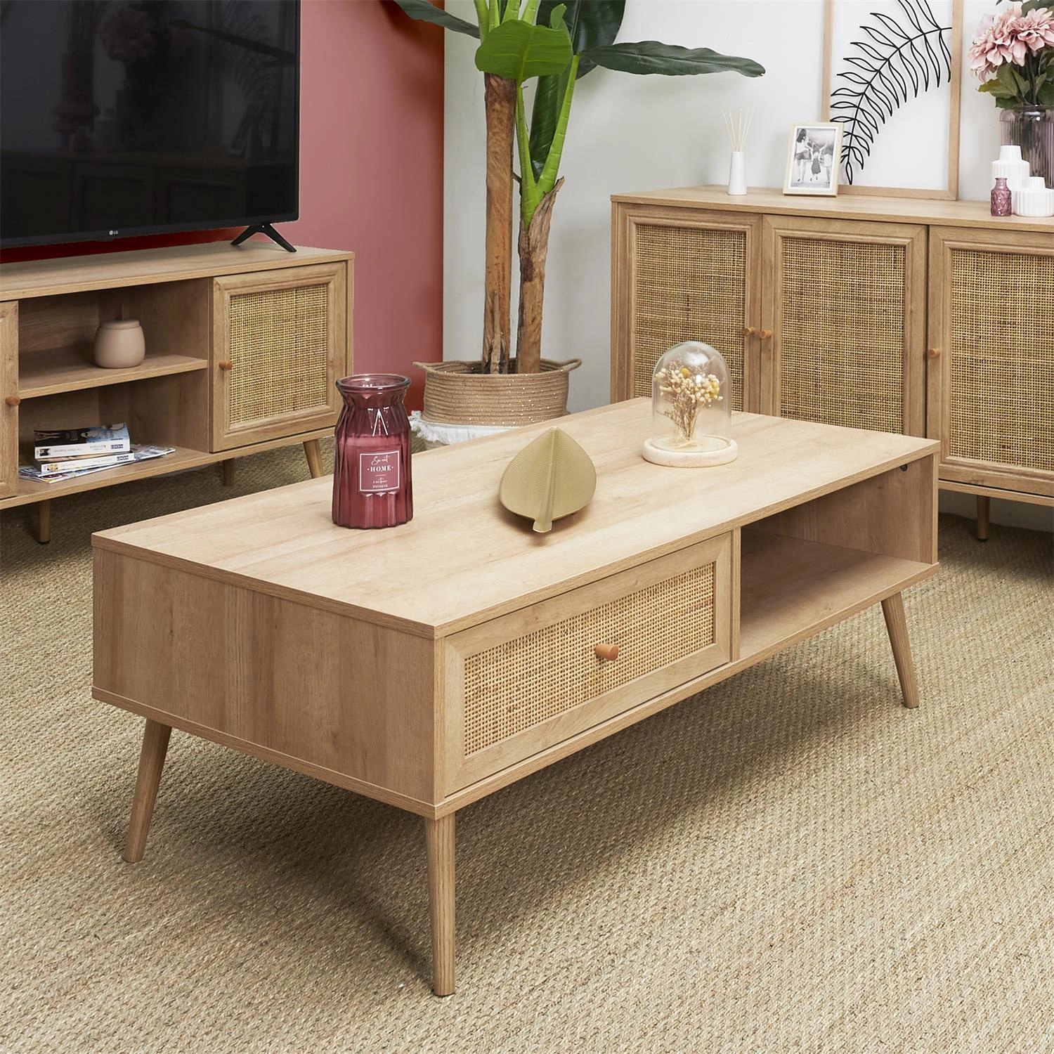 - Stolik kawowy: stół o lekkiej konstrukcji z szufladą o plecionym froncie, półką i obszernym blatem. Centralny element zestawu mebli do salonu Bali oraz każdego salonu. (Wysokość: 41,4 cm, Szerokość: 110 cm, Głębokość: 59 cm)