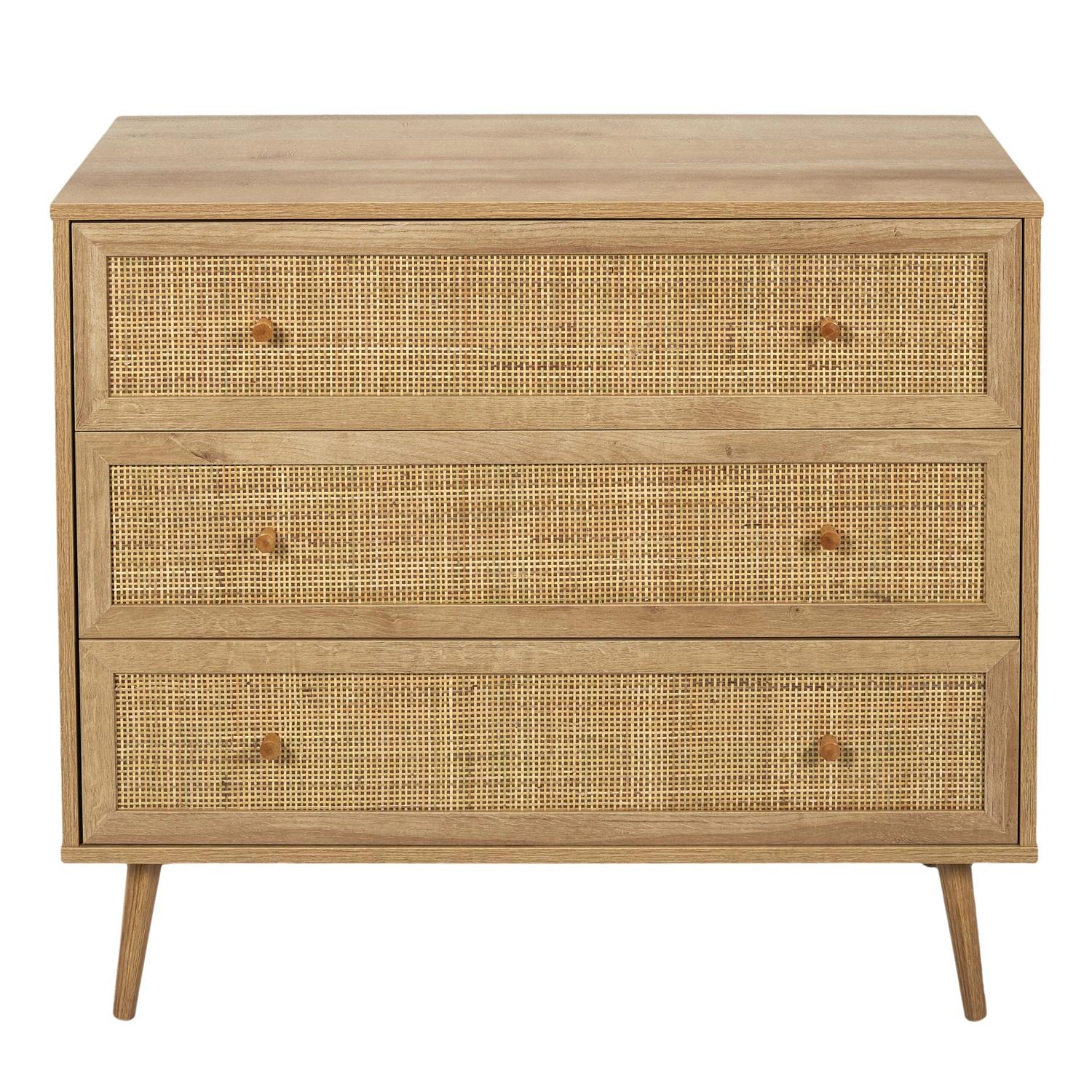 - Komoda trzydrzwiowa: posiadająca półki i pleciony front, idealna do przechowywania rzeczy, które chcesz ukryć przed wzrokiem gości. (Wysokość: 70 cm, Szerokość: 115 cm, Głębokość: 39 cm)