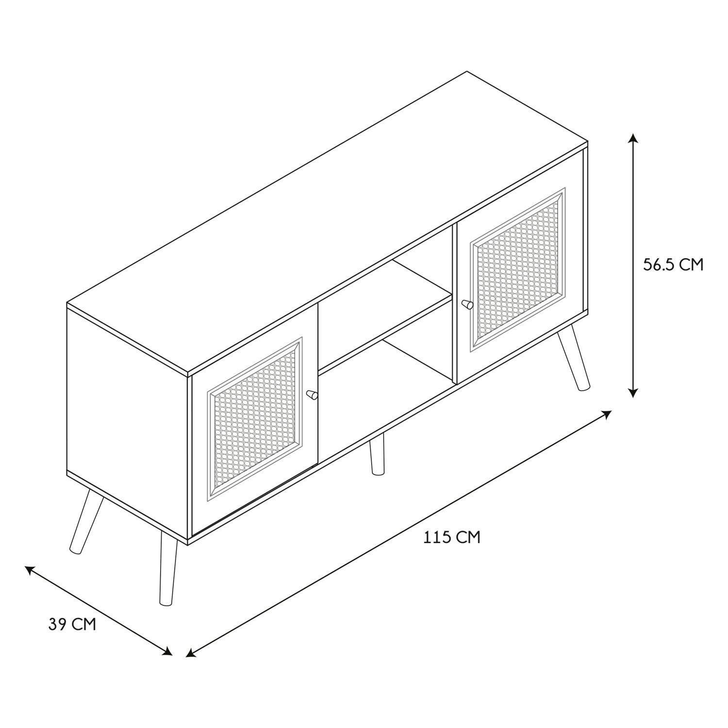 - Szafka RTV: pojemna szafka wyposażona w półki i drzwiczki z plecionką. Praktyczne rozwiązanie do przechowywania sprzętów elektronicznych i innych przedmiotów. (Wysokość: 56,5 cm, Szerokość: 115 cm, Głębokość: 39 cm)