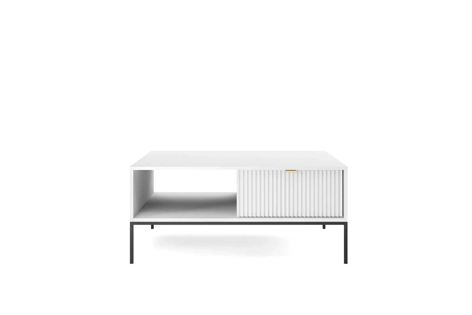 Doskonałym uzupełnieniem zestawu mebli do salonu jest również stolik kawowy z szufladą i ryflowanym frontem. Jego nowoczesny design łączy się z funkcją, co czyni go niezbędnym elementem każdego salonu. Przestronna szuflada umożliwia przechowywanie przeróżnych przedmiotów, zapewniając porządek i łatwy dostęp do wszystkiego, czego możemy potrzebować podczas relaksu w salonie. Front z płyty meblowej z ryflowaniem nadaje stolikowi unikalnej estetyki, a solidne nogi gwarantują stabilność i trwałość. Bez względu na to, czy szukasz stolika do serwowania porannej kawy, czy miejsca na ulubione książki, ten mebel z pewnością spełni Twoje oczekiwania.