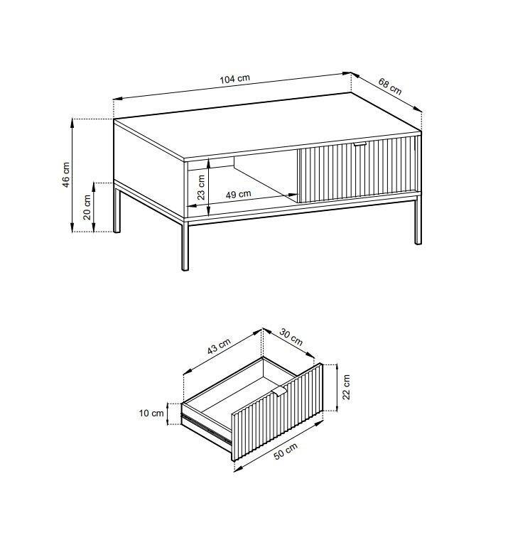 Doskonałym uzupełnieniem zestawu mebli do salonu jest również stolik kawowy z szufladą i ryflowanym frontem. Jego nowoczesny design łączy się z funkcją, co czyni go niezbędnym elementem każdego salonu. Przestronna szuflada umożliwia przechowywanie przeróżnych przedmiotów, zapewniając porządek i łatwy dostęp do wszystkiego, czego możemy potrzebować podczas relaksu w salonie. Front z płyty meblowej z ryflowaniem nadaje stolikowi unikalnej estetyki, a solidne nogi gwarantują stabilność i trwałość. Bez względu na to, czy szukasz stolika do serwowania porannej kawy, czy miejsca na ulubione książki, ten mebel z pewnością spełni Twoje oczekiwania.