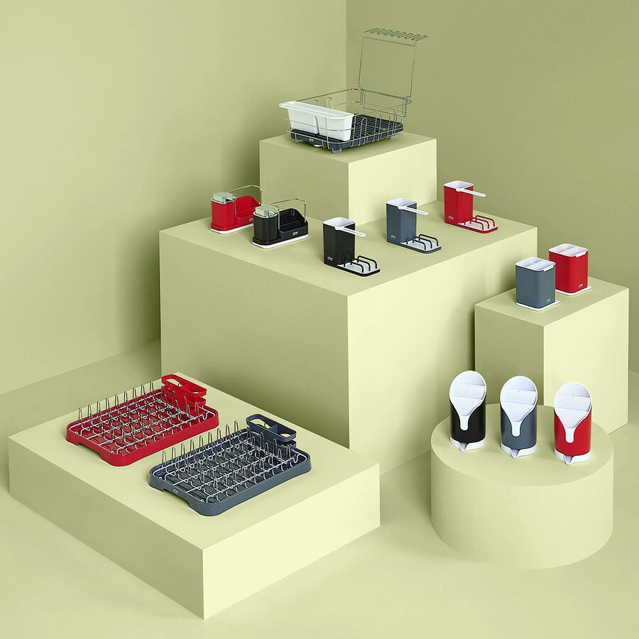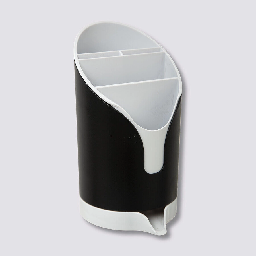 - Dzięki różnym przegródkom i ściętemu kształtowi, ociekacz pomieści duże naczynia, noże oraz średnie i małe sztućce w uporządkowany sposób
