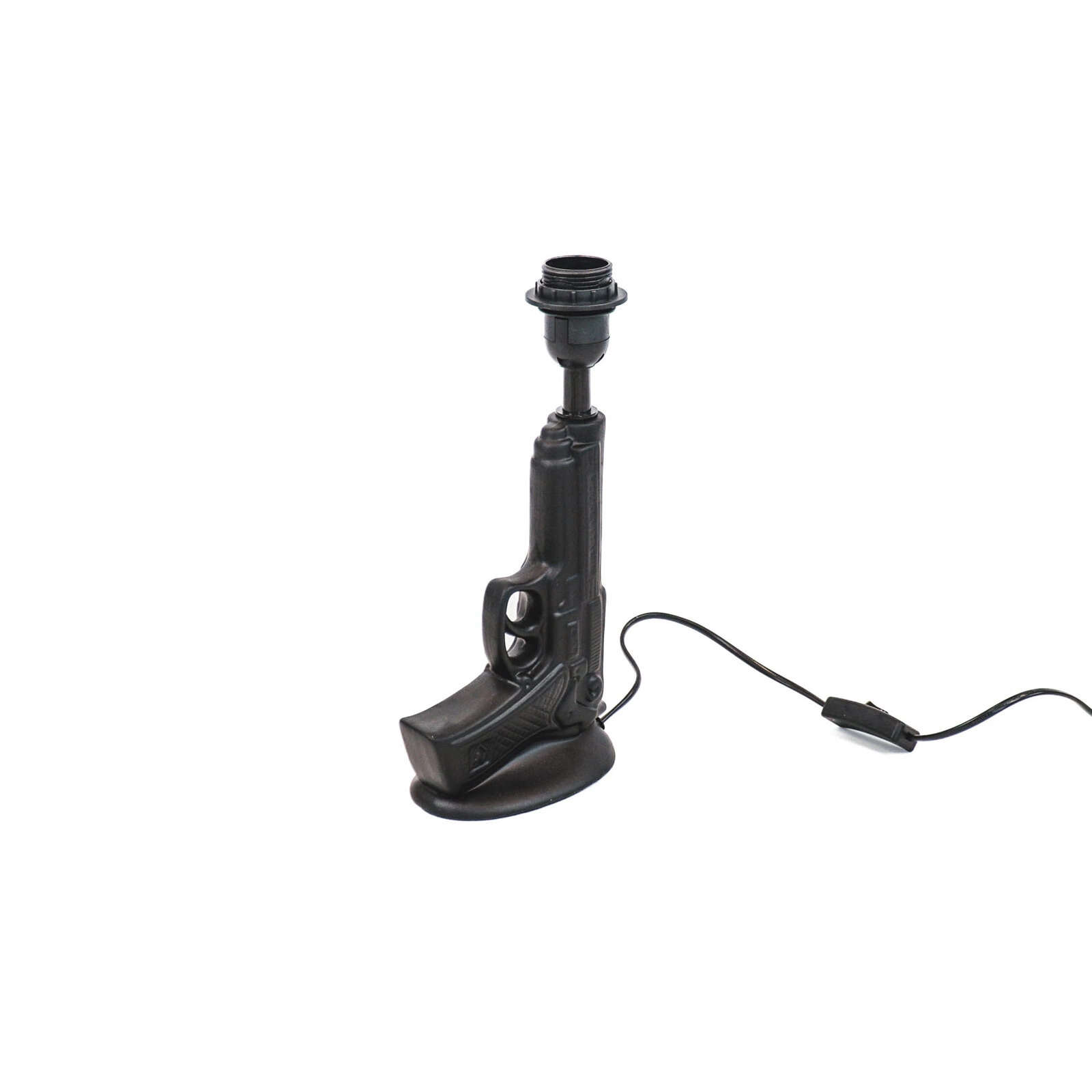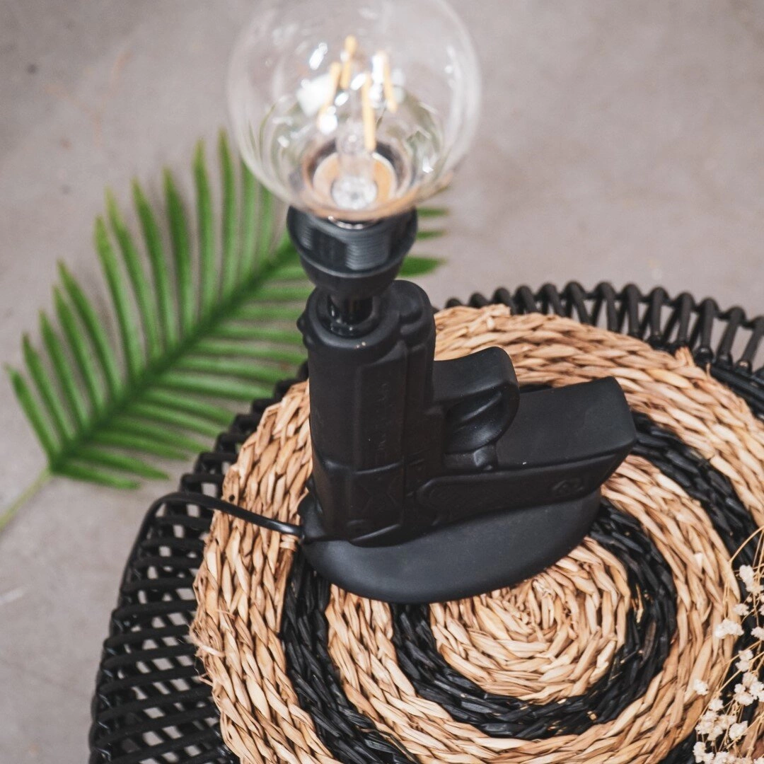 Dzięki uniwersalnemu rozmiarowi i długości przewodu 100 cm, lampka Gun świetnie odnajdzie się zarówno na stoliku nocnym, jak i na regale w salonie czy biurku w pokoju młodzieżowym. Stabilna podstawa z ceramiki i metalu gwarantuje bezpieczeństwo użytkowania nawet w dynamicznym otoczeniu. Lampka nie posiada abażuru, co dodatkowo potęguje jej industrialny styl i pozwala cieszyć się pełnym efektem dekoracyjnym żarówki.