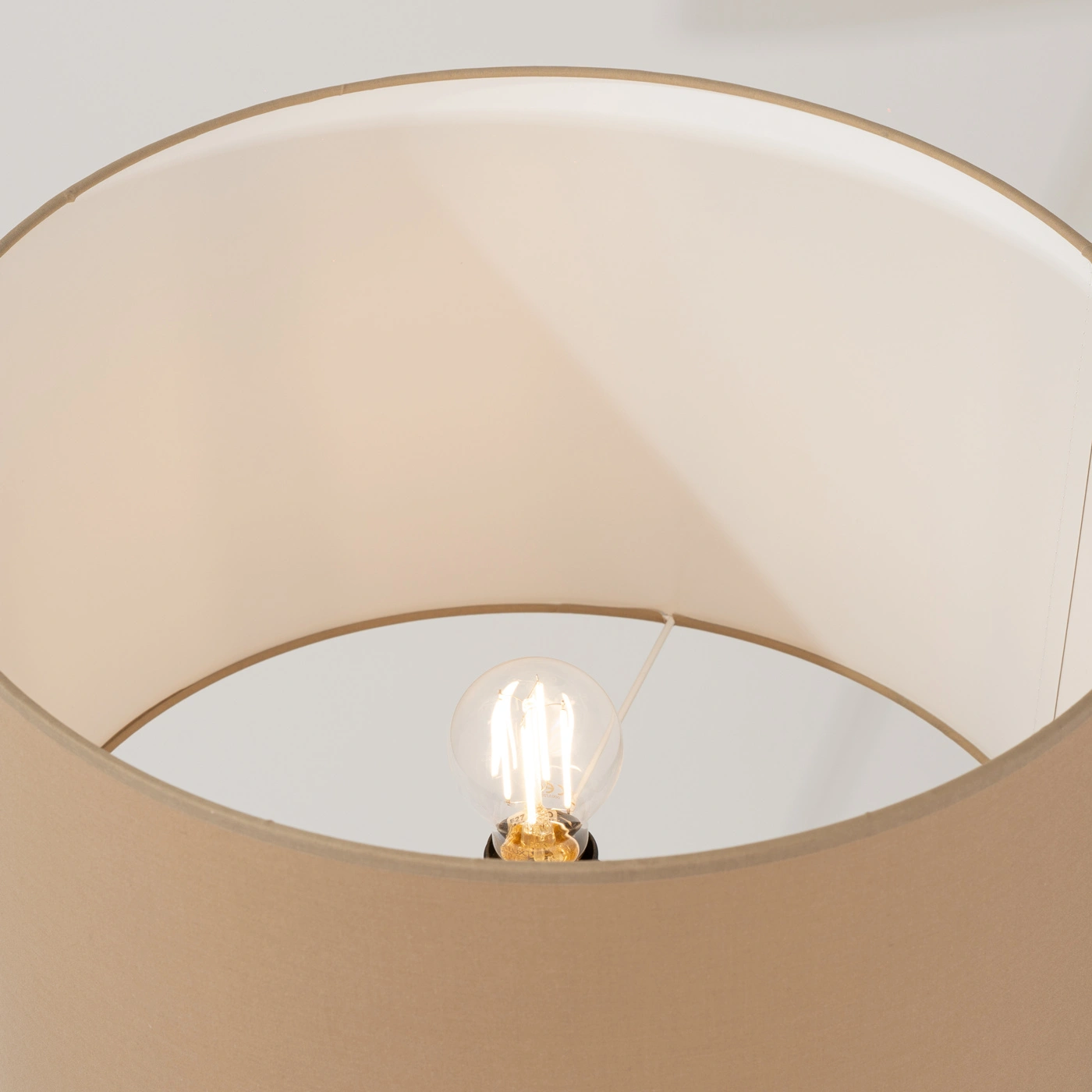 - Abażur z tkaniny w kolorze taupe – miękkie, przyjazne światło w Twoim salonie