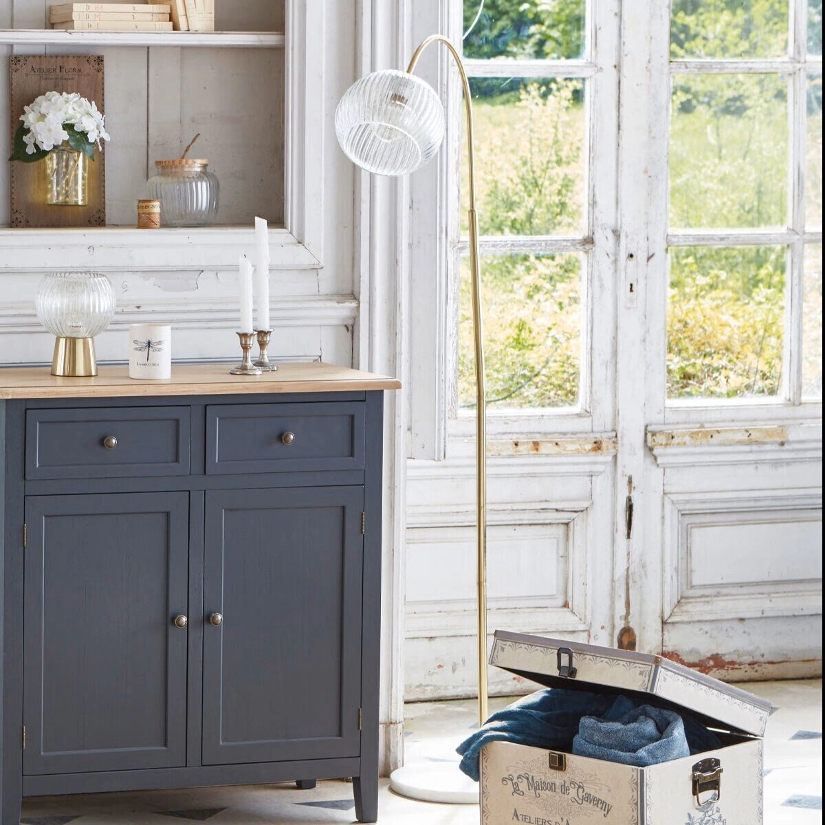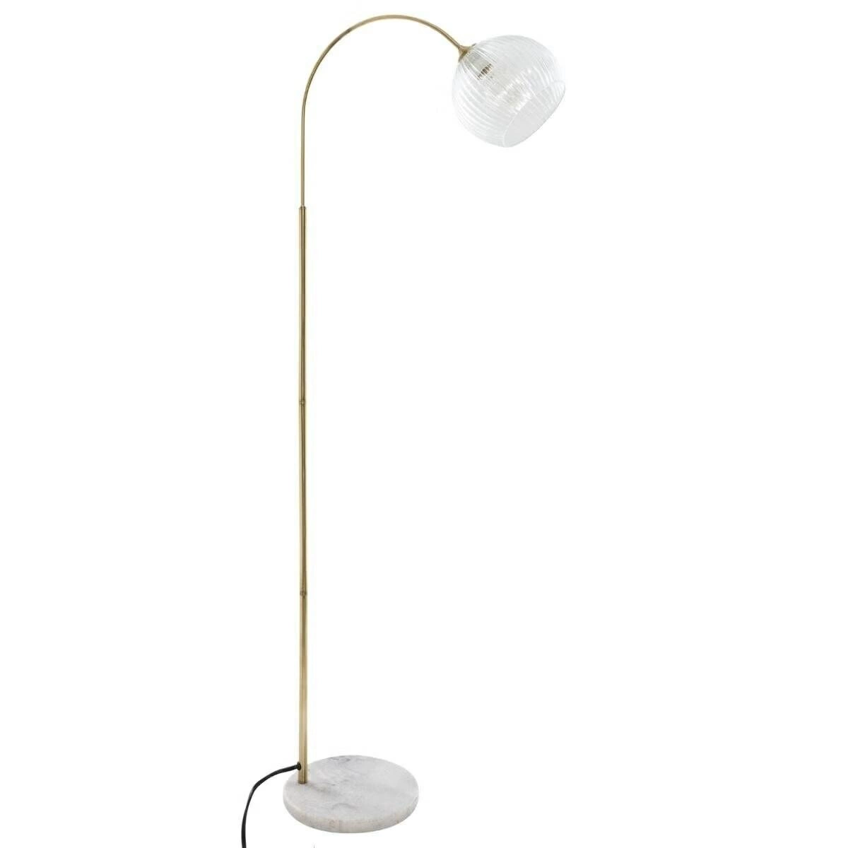 - Lampa podłogowa Laye łączy marmurową podstawę, żelazną tubę i szklany klosz.