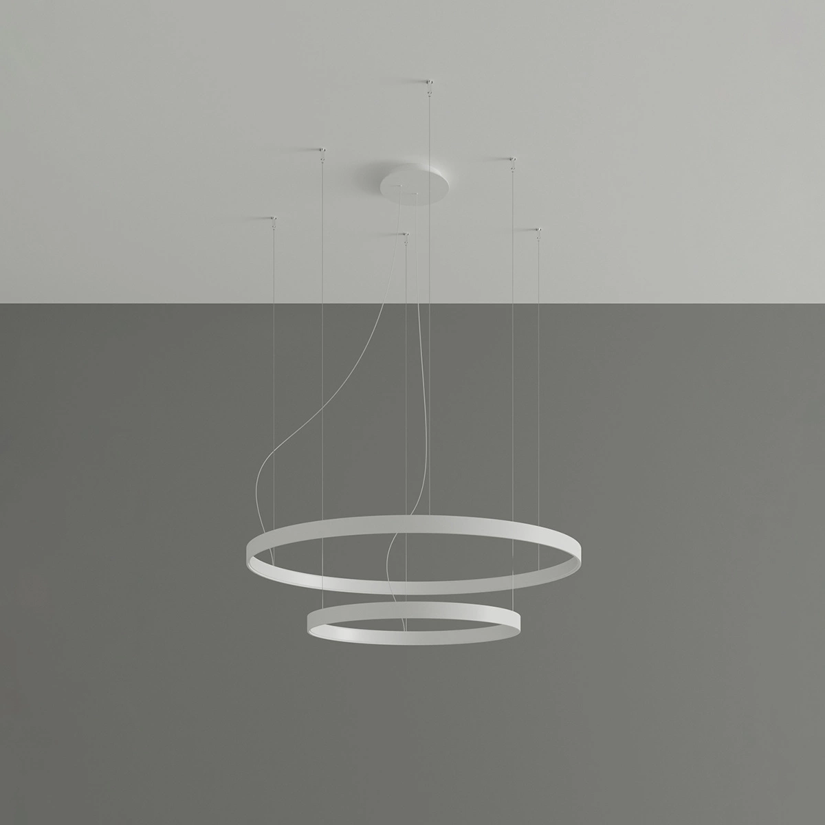 RIO 2 od Thoro to propozycja dla miłośników nowoczesnego stylu i funkcjonalności. Geometryczna forma oparta na dwóch subtelnych okręgach sprawia, że żyrandol LED staje się nie tylko praktycznym źródłem światła, ale także efektowną dekoracją sufitu. Biel oprawy dodaje lekkości i harmonijnie współgra z jasnymi oraz kontrastującymi aranżacjami. Transparentny przewód oraz dyskretna, biała podsufitka podkreślają czystość formy i ułatwiają dopasowanie lampy do różnych pomieszczeń.
