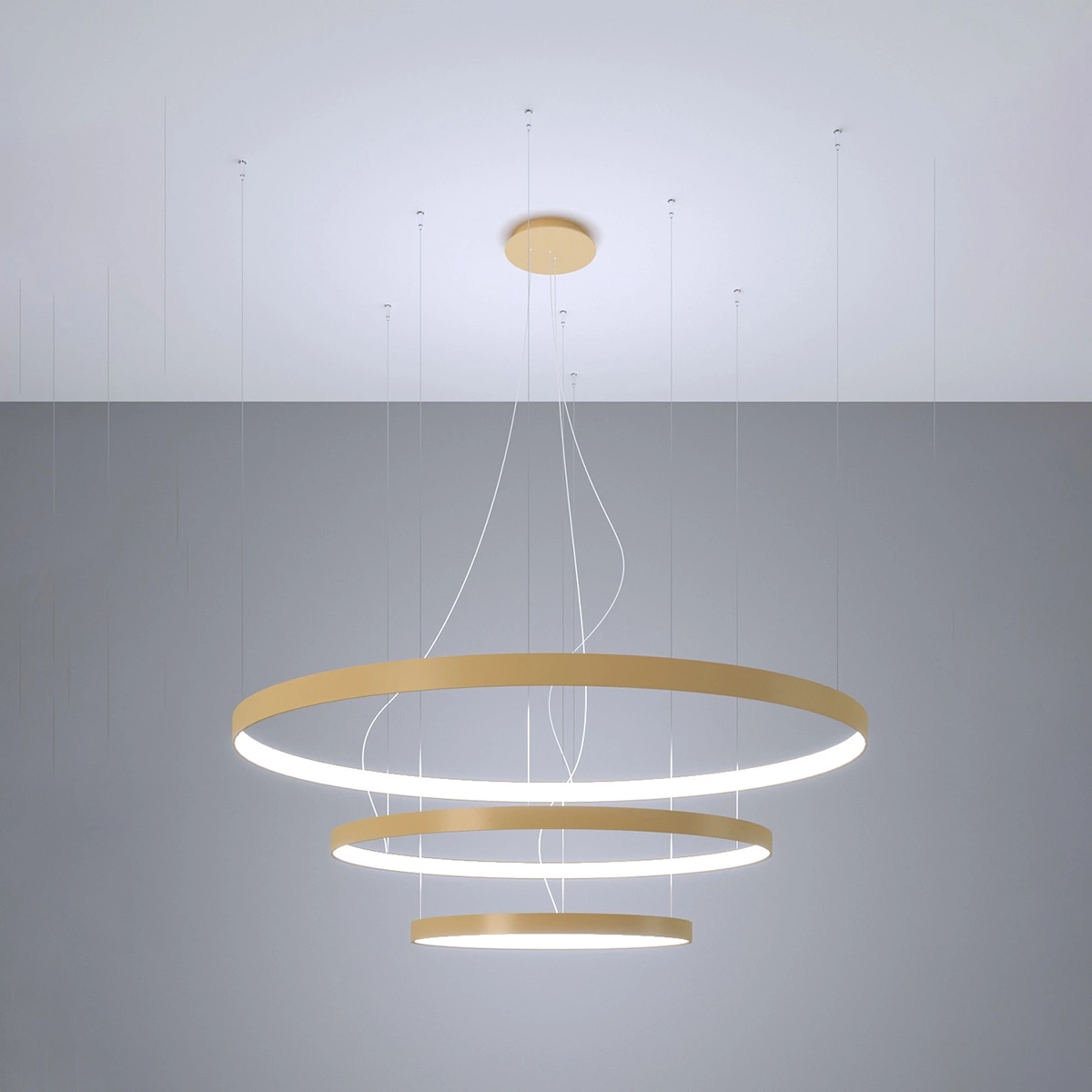 Żyrandol RIO 3 od marki SOLLUX LIGHTING to wyjątkowe połączenie nowoczesnej estetyki i funkcjonalności. Złoty kolor oprawy dodaje elegancji, a nowoczesne okręgi ledowe gwarantują doskonałe parametry świecenia. Dzięki swojej wszechstronności, ten model świetnie sprawdzi się zarówno w przestrzeniach prywatnych, jak i publicznych.