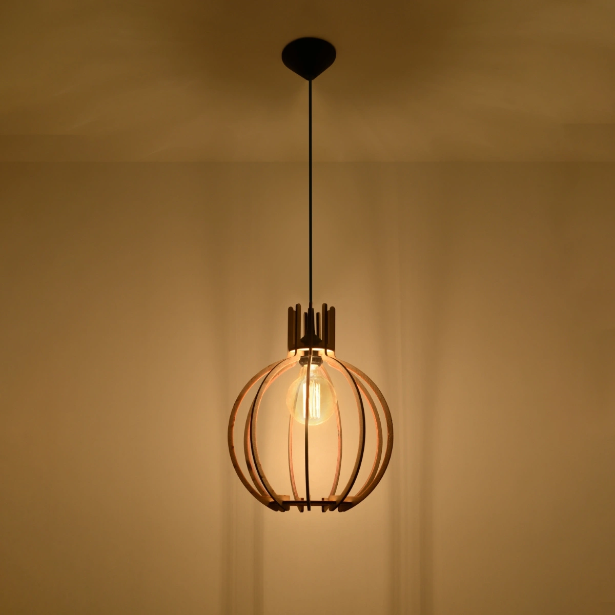 Arancia została zaprojektowana z myślą o uniwersalności. Świetnie sprawdzi się jako lampa do salonu nad stolik kawowy, żyrandol do sypialni nad łóżko czy lampa nad wyspę kuchenną. Wysokość 100 cm umożliwia dopasowanie do większości standardowych wnętrz, a pojedynczy punkt świetlny doskonale doświetla wybraną strefę bez przytłaczania przestrzeni. Naturalny kolor drewna łatwo zestawić z innymi elementami wyposażenia, zarówno w jasnych, jak i ciemniejszych aranżacjach.