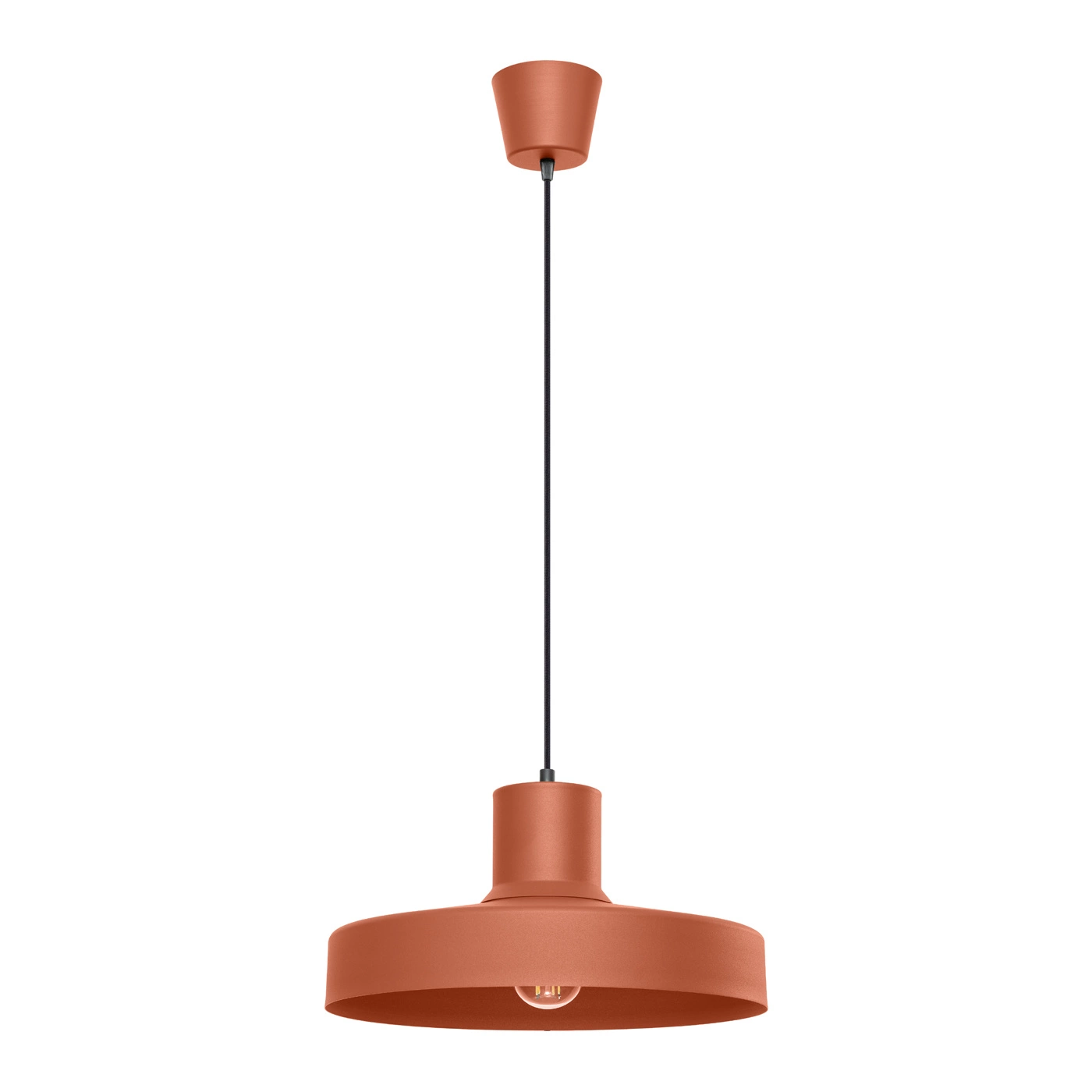 - Metalowy klosz w kolorze ochrowej czerwieni – przyciąga wzrok i urozmaica wnętrze