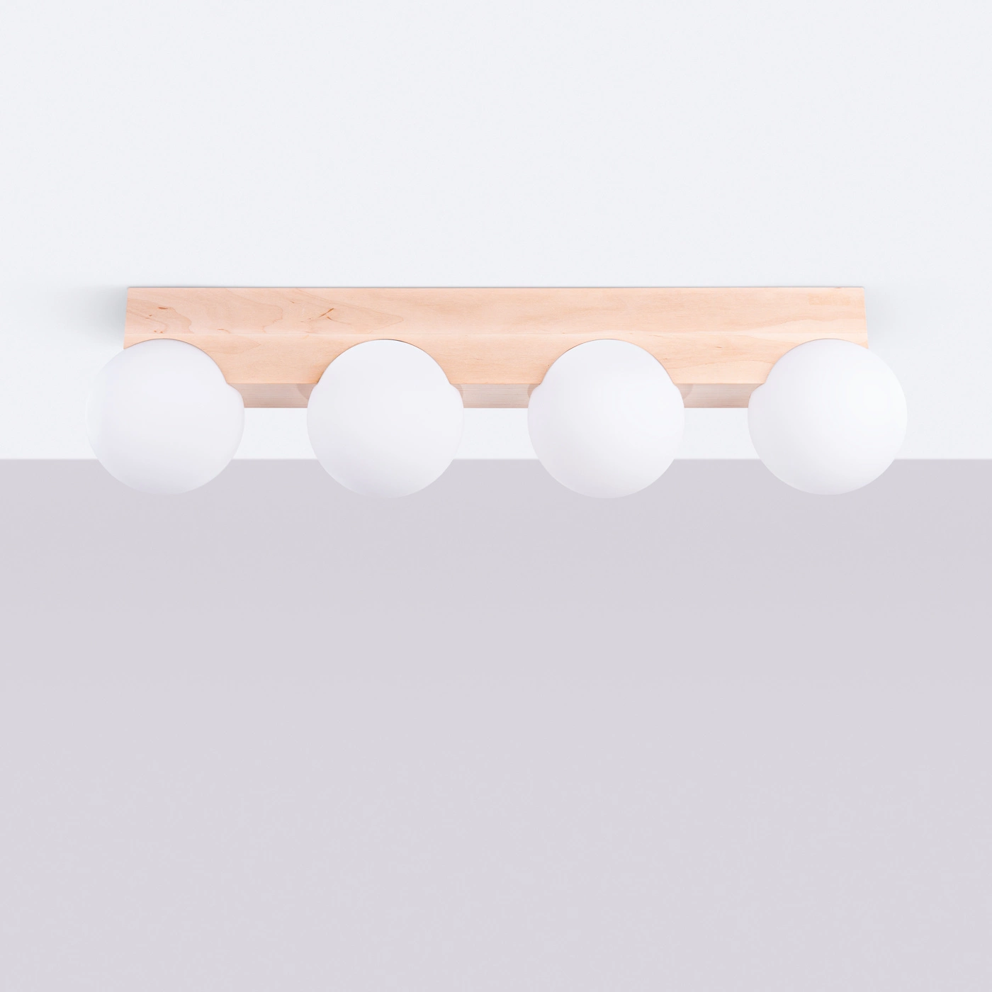 Plafon sufitowy BULBO 4 marki Sollux to połączenie nowoczesnego designu i naturalnych materiałów – drewna i szkła. Model ten wyróżnia się okrągłymi, białymi kloszami zamontowanymi na naturalnej drewnianej podstawie, co nadaje lampie wyjątkowy, ciepły charakter. Plafon BULBO 4 o długości 63 cm i wysokości 16 cm został zaprojektowany z myślą o funkcjonalnym oświetleniu salonu, sypialni, kuchni, przedpokoju lub pokoju młodzieżowego. Cztery źródła światła pozwalają uzyskać jasne, równomierne rozproszenie światła, podkreślając nowoczesny styl wnętrza.