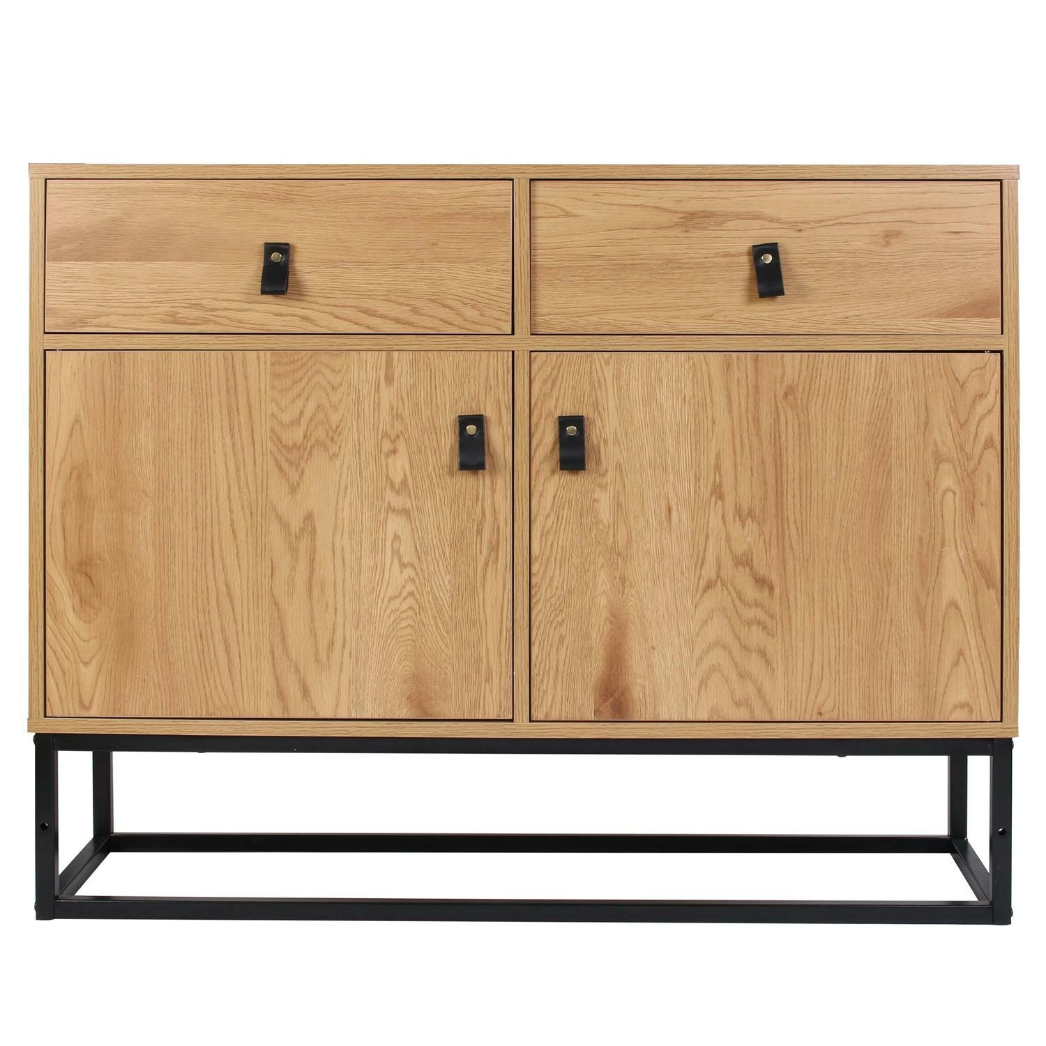 Komoda Abbott jest w stanie bardzo wiele pomieścić. Na dole dwie pojemne, bardzo szerokie szafki. Nad nimi dwie szuflady. Całość wieńczy gładki blat w kontrastowym kolorze. Projektując komodę Abbott, zadbaliśmy o to, aby jej użytkowanie było przyjazne i wygodne. W miejscach uchwytów zastosowaliśmy delikatne paski z eko skóry. Komoda powstała z wysokiej jakości płyt laminowanych. Struktura laminatu imituje naturalne wybarwienie i słoje drewna. Całość wspiera się na solidnym, wytrzymałym stelażu z metalu, malowanego na kolor czarny.