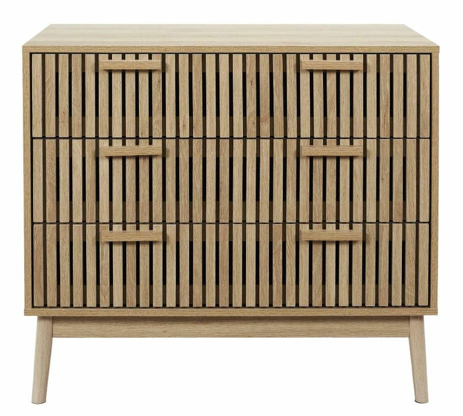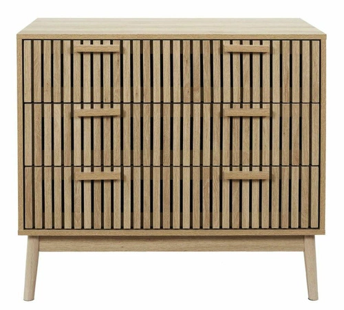 Komoda Klaus to połączenie modnego koloru okleiny imitującej naturalny kolor drewna sosnoweg oraz modnych i klasycznych lameli. Korpus oraz fronty komody wykonane zostały z płyty MDF, natomiast nogi komody z drewna sosnowego. Komoda wyposażona została w trzy szuflady, które wysuwaj się na metalowych szynach.