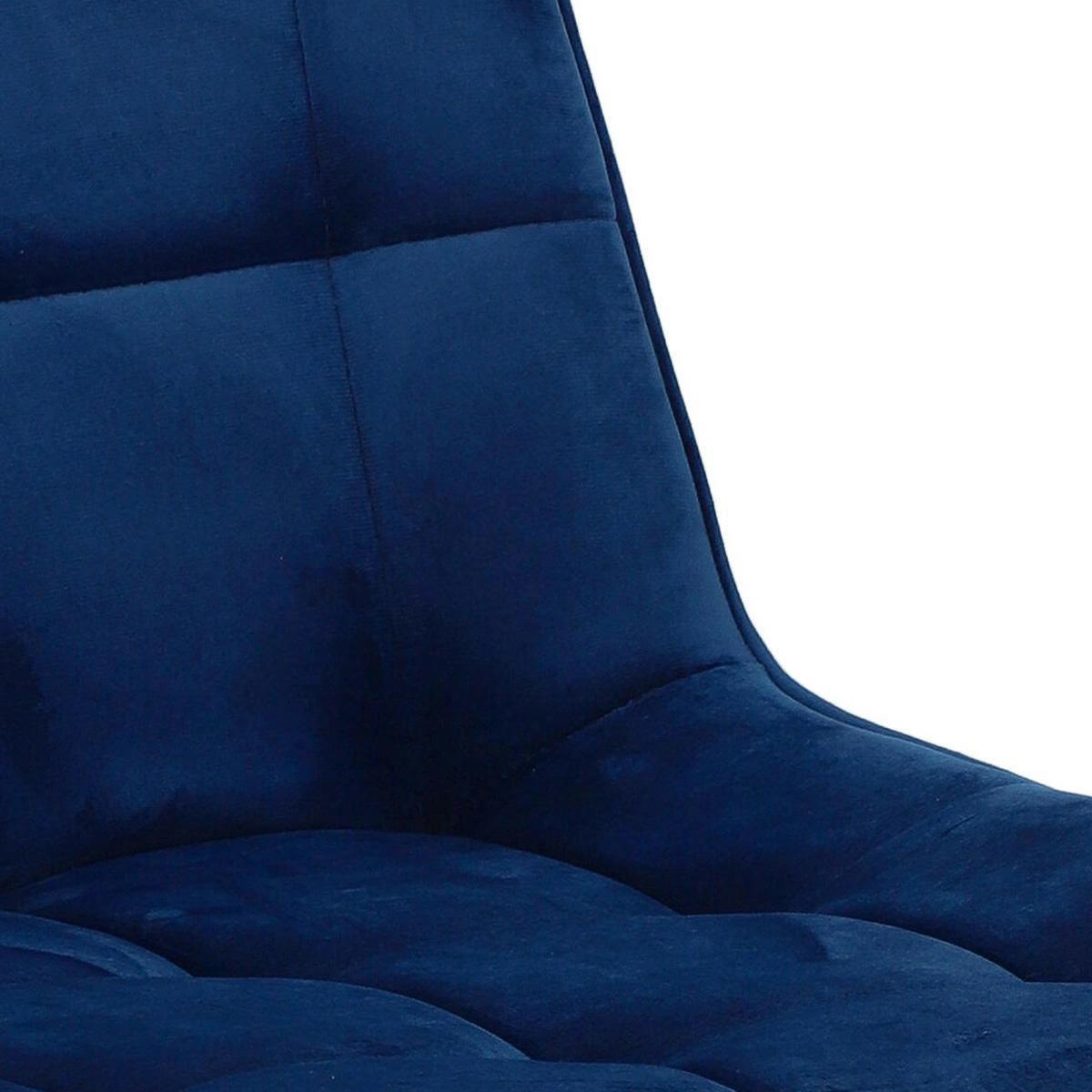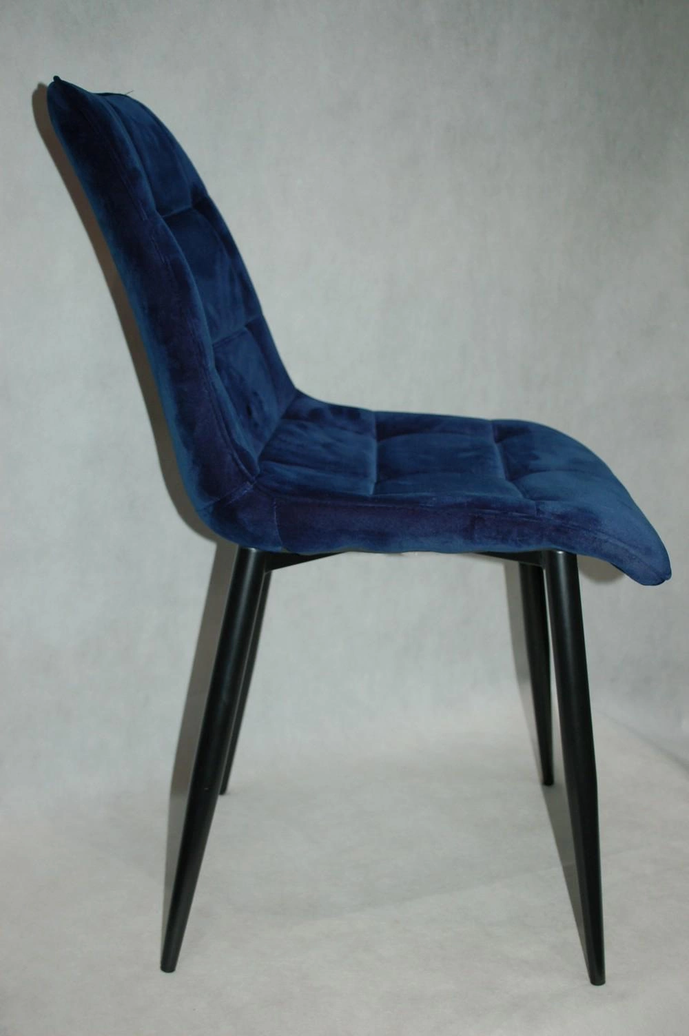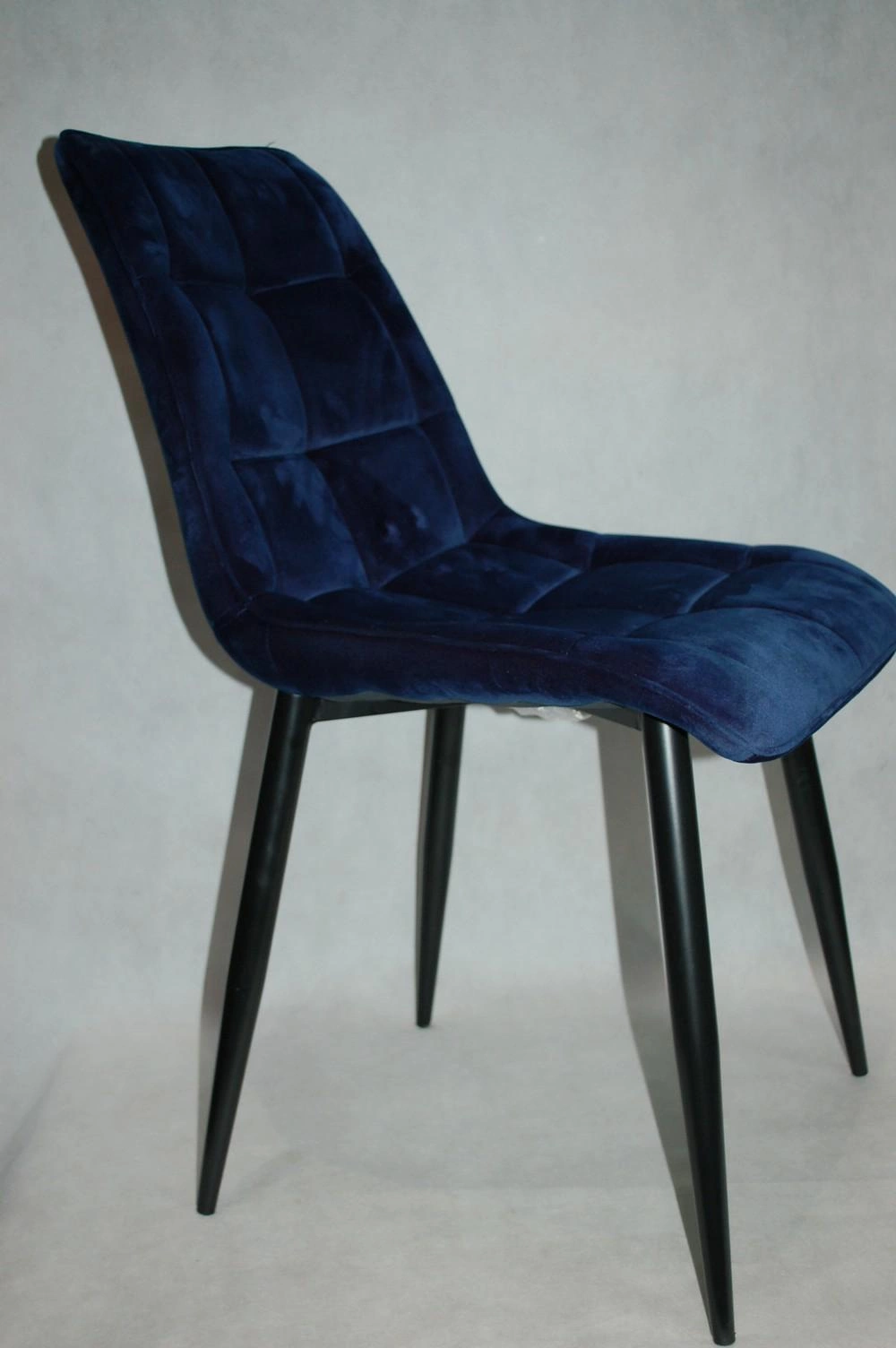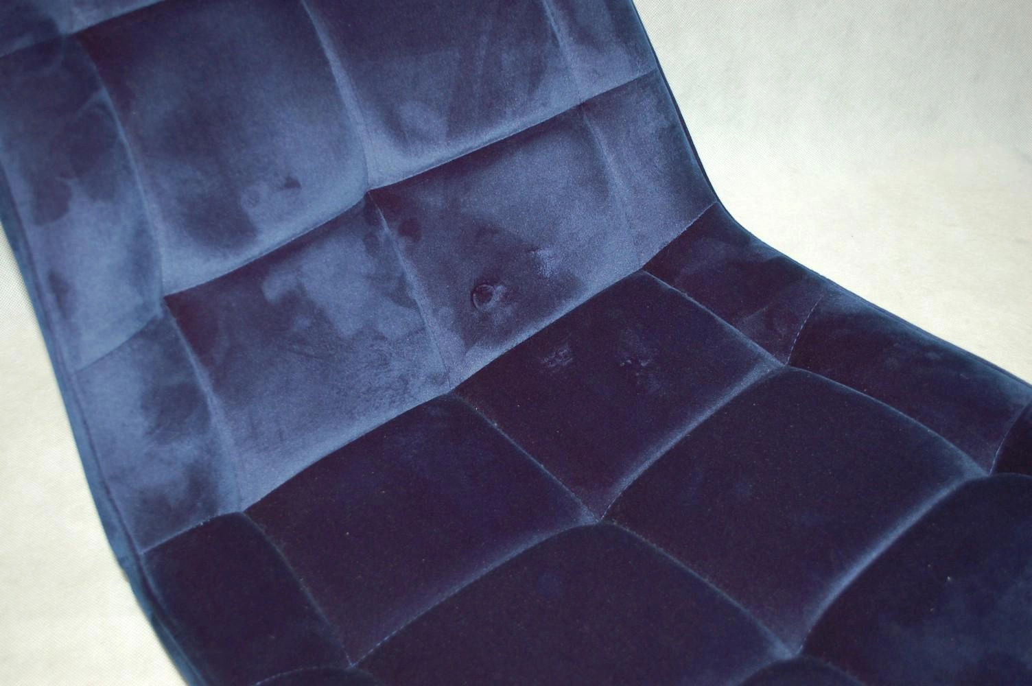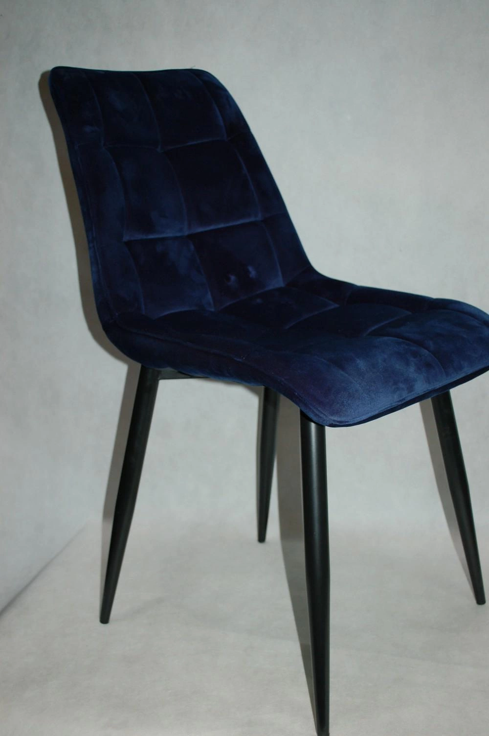 Tapicerowane welwetowe krzesło Plaid w granatowym kolorze to modny mebel, który będzie idealnym krzesłem do salonu lub jadalni w stylu modern glamour. Tapicerowane, regularnie pikowane siedzisko krzesła jest niezwykle wygodne dzięki wyprofilowanemu oparciu. Krzesło nie posiada podłokietników, dzięki czemu wsuniemy je pod każdy stół, jednocześnie oszczędzając miejsce w salonie. Metalowe, malowane proszkowo na złoto nogi są odporne na uszkodzenia. Błyszczące wykończenie nóg krzesła jest eleganckie i dodaje meblowi nowoczesnego wyglądu. Nóżki krzesła zakończone zostały stopkami z tworzywa. Max.obciążenie krzesła: 120 kg.