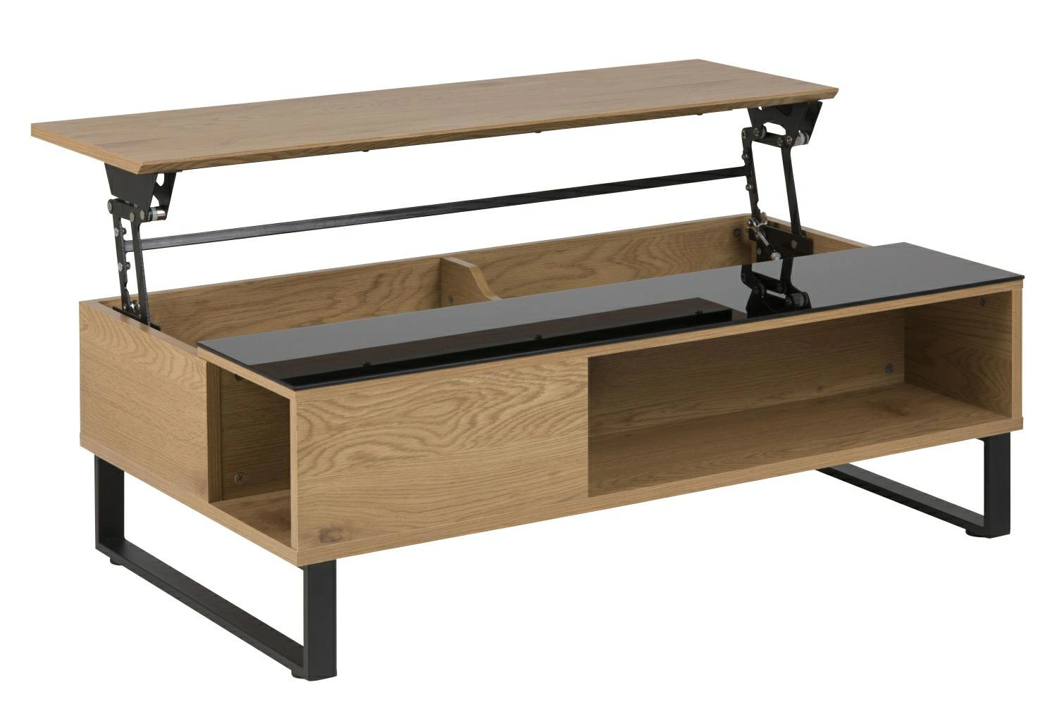 Stolik kawowy Azalea to funkcjonalny stolik dla modnego salonu. Stolik został zrobiony ze sklejki z okleiną w kolorze dzikiego dębu. Połowa blatu została pokryta 5mm dymionym szkłem. Podstawe stolika tworzą metalowe matowe nogi. Dzięki temu że zostały pomalowane proszkowo są idealnie pokryte czarnym barwnikiem. Stolik jest otwierany od góry. Posiada dwie półki i schowek.