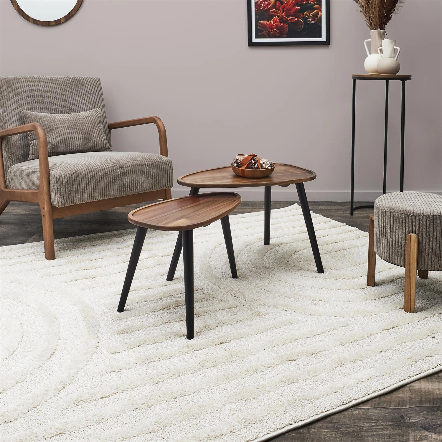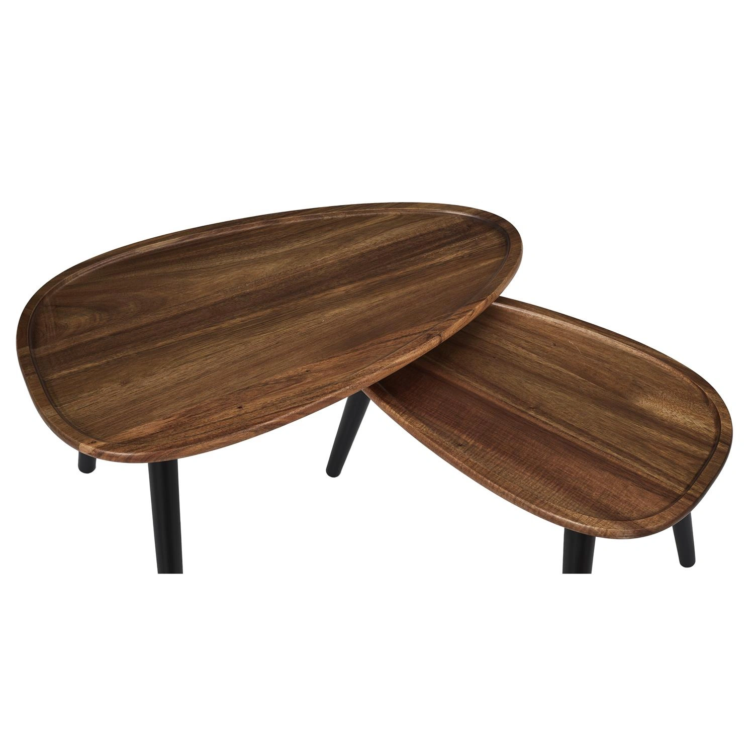 Zestaw dwóch drewnianych stolików kawowych Noby sprawdzi się zarówno w dużym jak i małym salonie. Stoliki wykonane z drewna akacji jako blat oraz drewna sosnowego jako nogi są w 100% wykonane z naturalnych materiałów. Stoliki można zestawić ze sobą, można postawić jeden pod drugim, albo postawić je całkowicie oddzielnie. Stoliki wymagają montażu. Max. obciążenie na jeden stolik 15kg