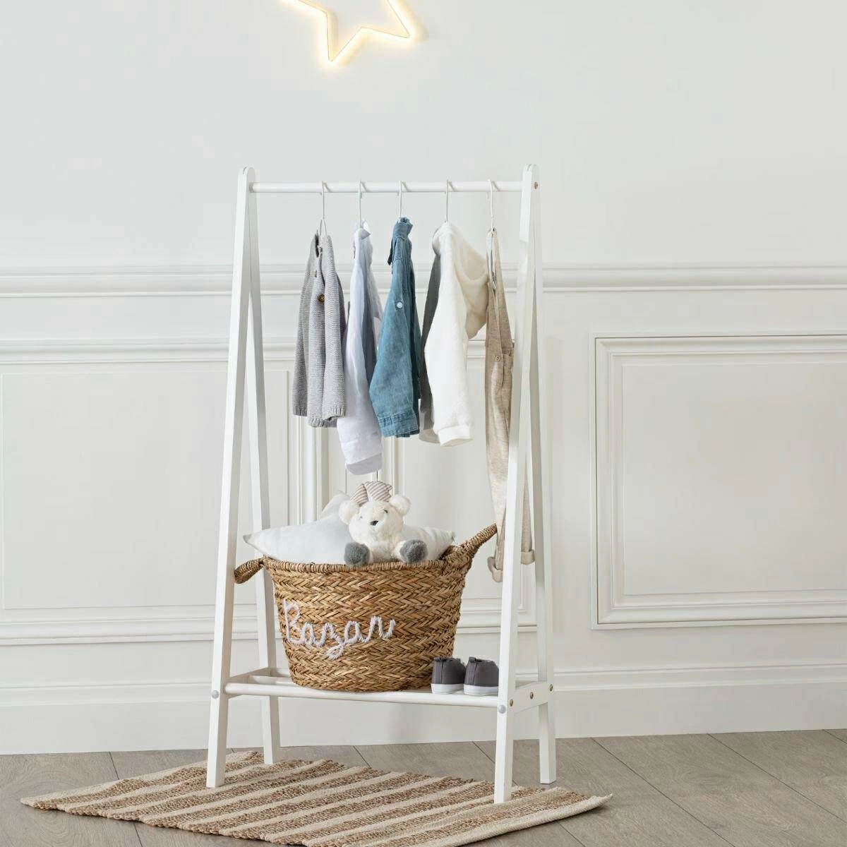 Aby stylowo zorganizować sypialnię swojego dziecka, postaw na ten wieszak na ubrania. Jej elegancki design i kompaktowe wymiary sprawiają, że idealnie pasuje do każdej przestrzeni. Jeśli kochasz delikatność skandynawskiego stylu, pokochasz tę szafę, która jest równie urocza, co dyskretna. Ten schowek ma drążek do wieszania ubrań dziecięcych: sukienki, płaszcze i koszule znajdą swoje miejsce. Na buty lub stosy spodni można wykorzystać półkę w dolnej części regału.