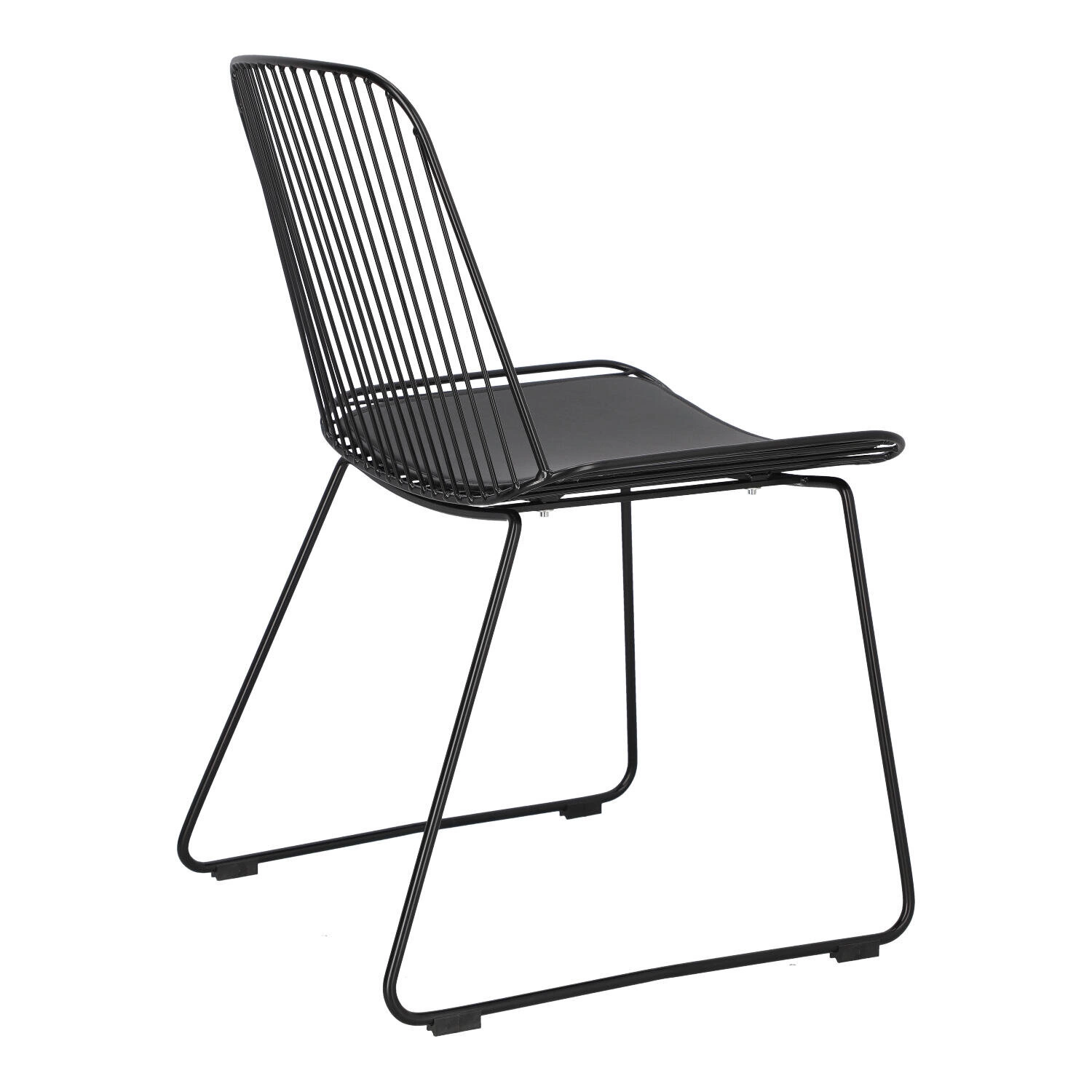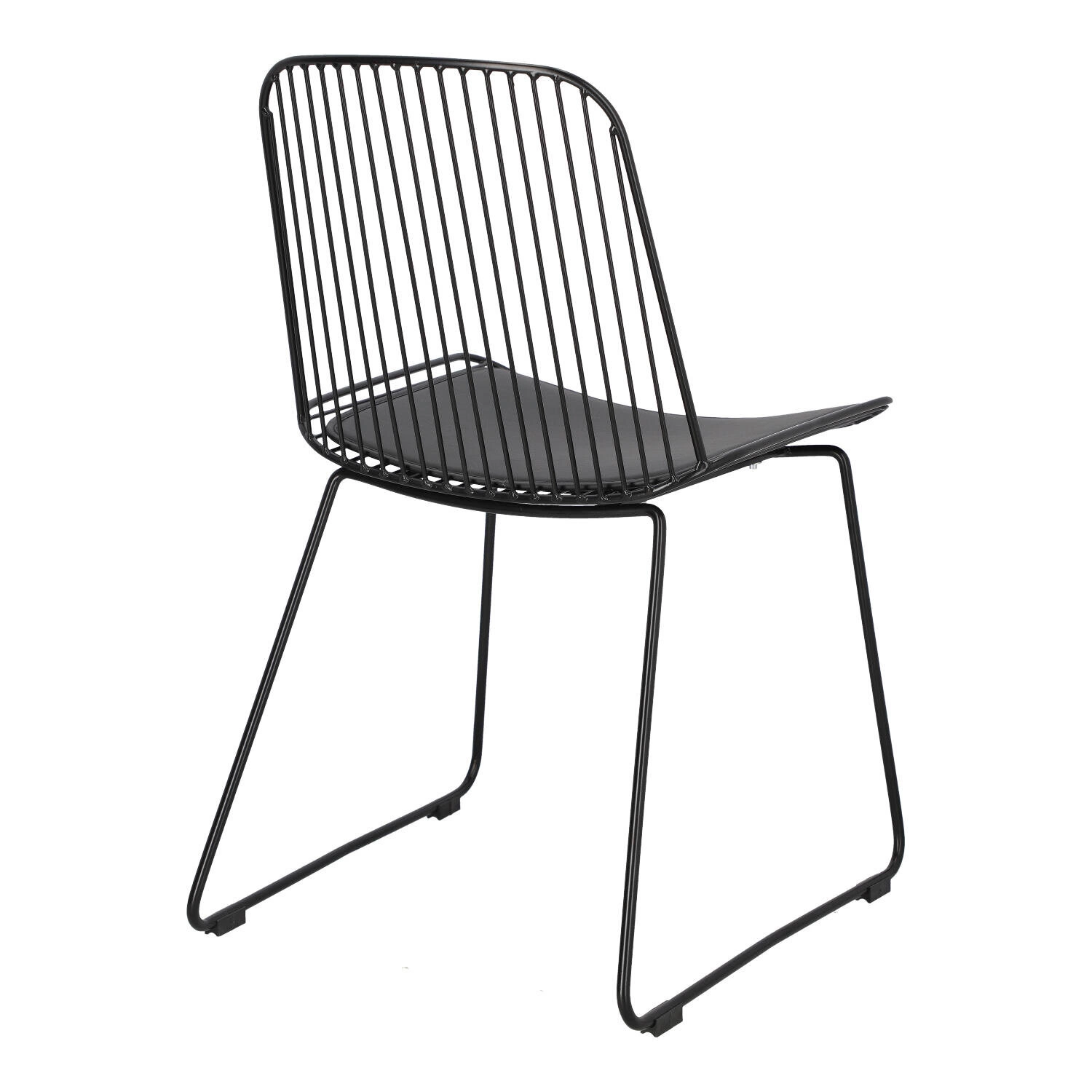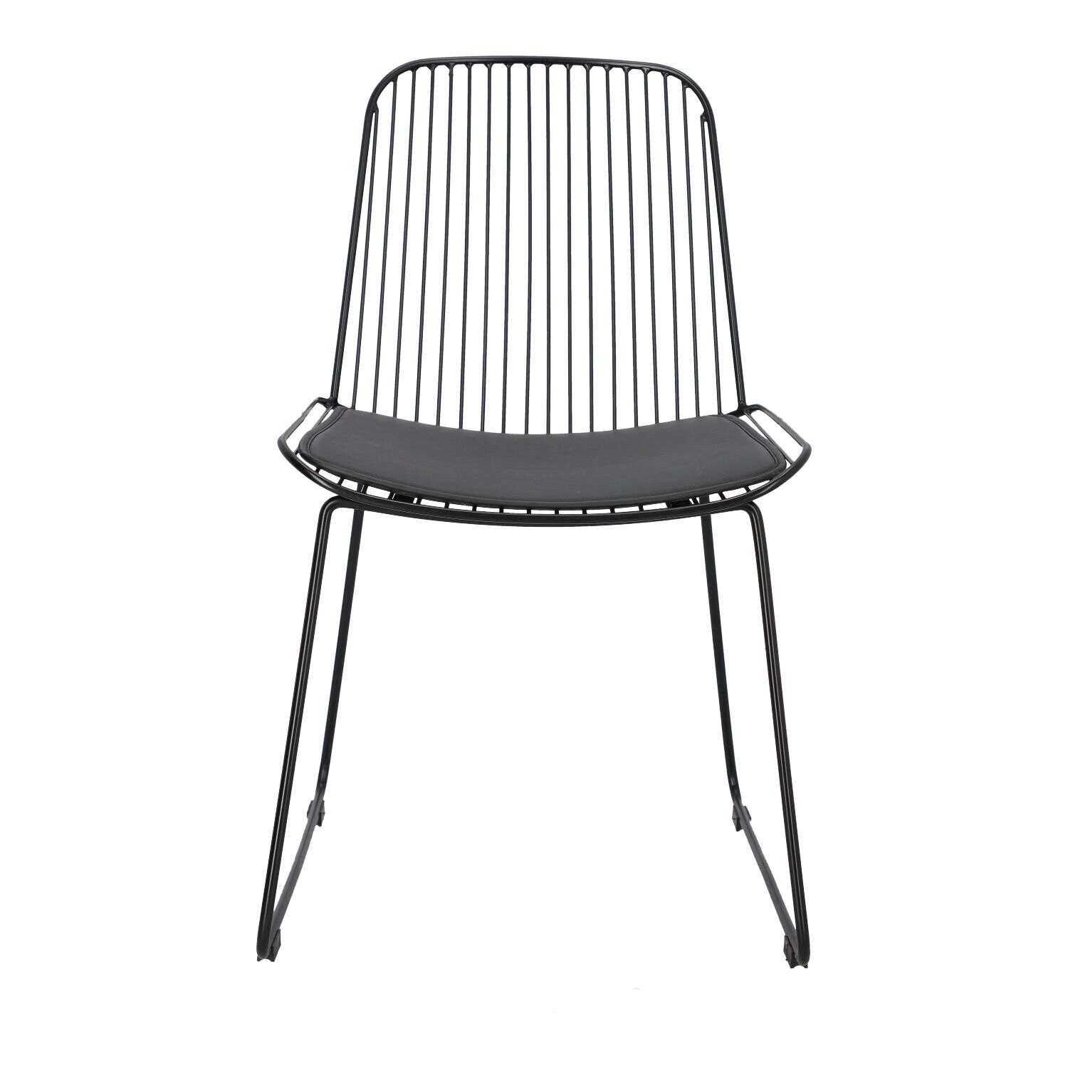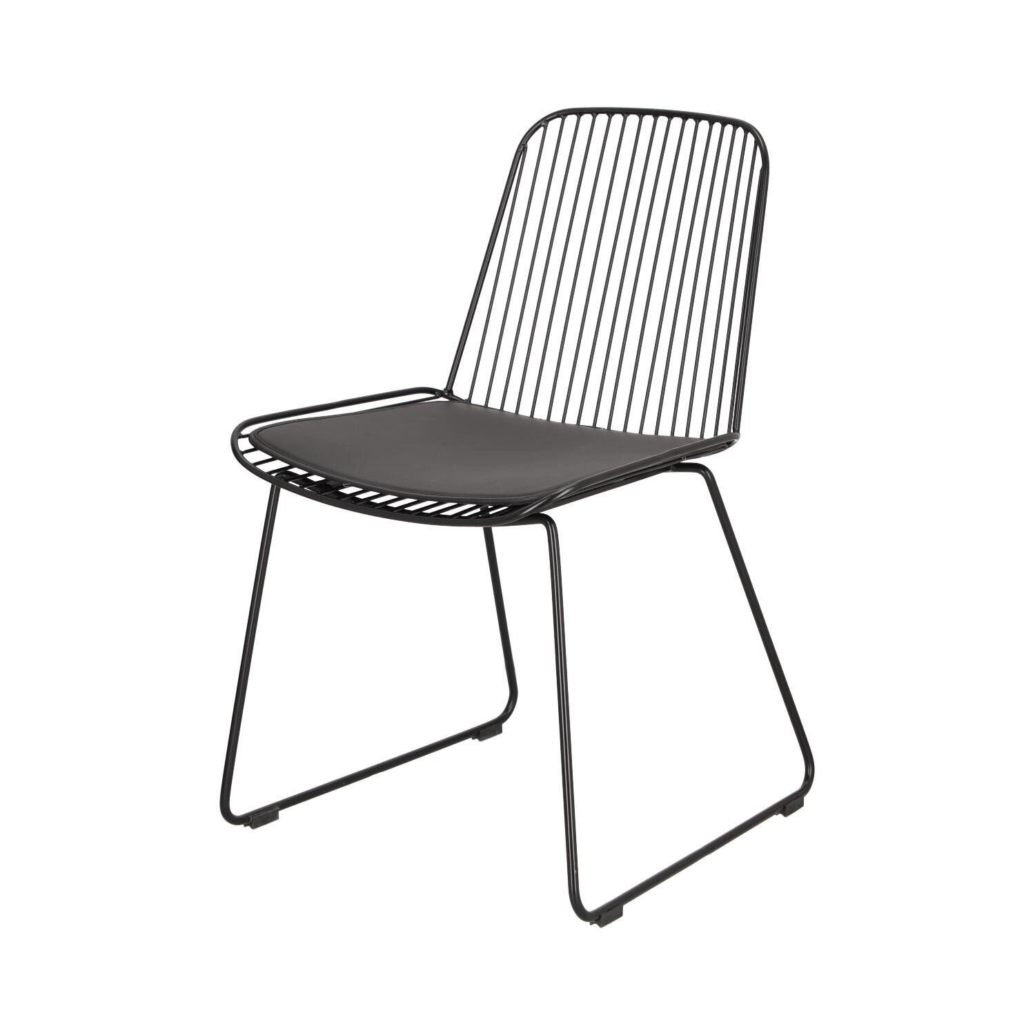 Czarne loftowe krzesło Dill z poduszką z eko skóry to odważny projekt do nowoczesnego wnętrza. Zachwycające w swojej prostocie krzesło będzie nie tylko wygodnym siedziskiem, ale również ozdobą salonu lub jadalni. Krzesło o siedzisku oraz oparciu wykonanych z wielu cienkich przęseł jest nietypowym meblem. Podstawa krzesła to płozy zabezpieczone nakładką z tworzywa, która zapobiega rysowaniu się powietrzni pod krzesłem. Krzesło z metalu pomalowanego proszkowo na czarno utrzymane zostały w półmatowym wykończeniu. Poduszka na siedzisku jest zdejmowana. Cechy produktu: - odpryski farby na podstawie