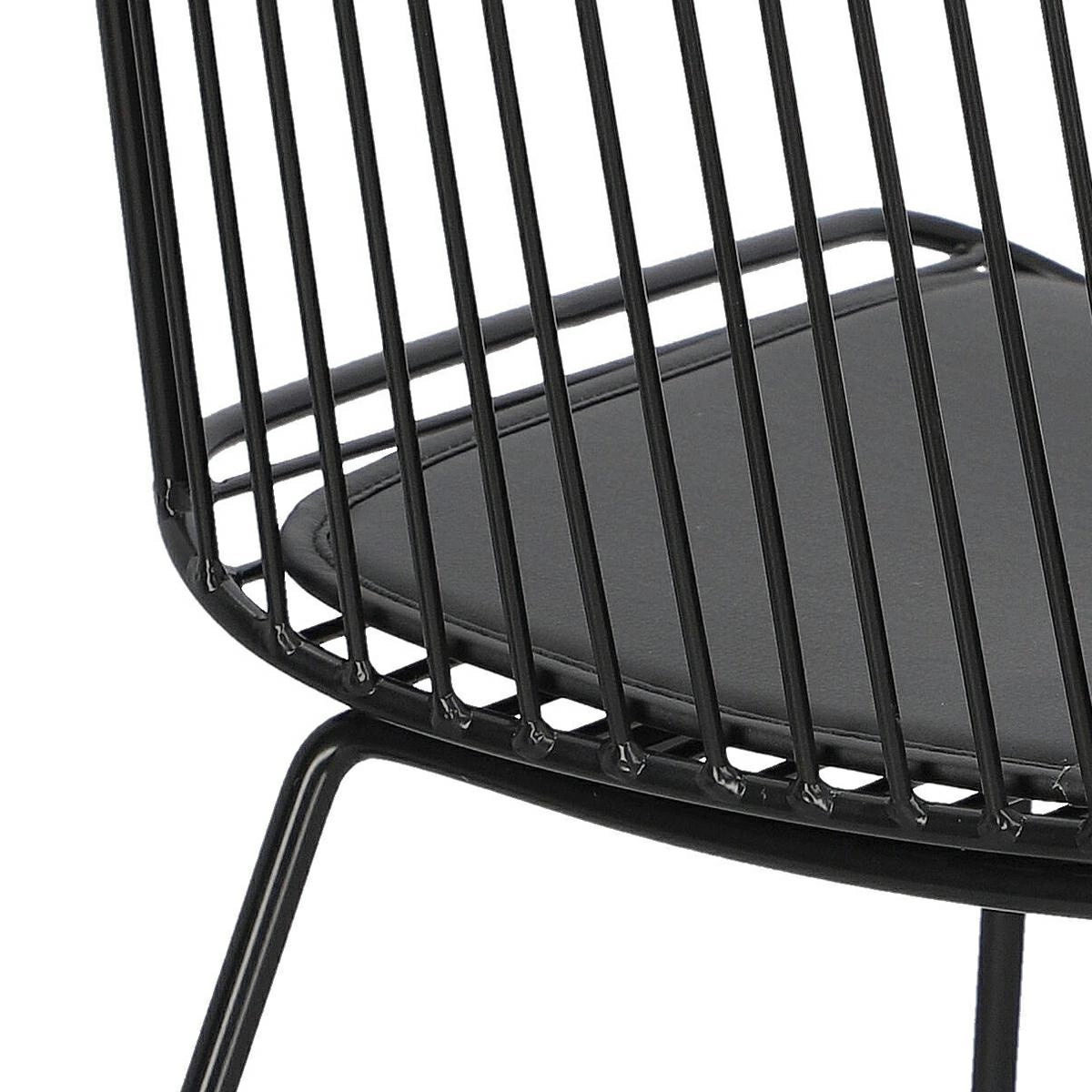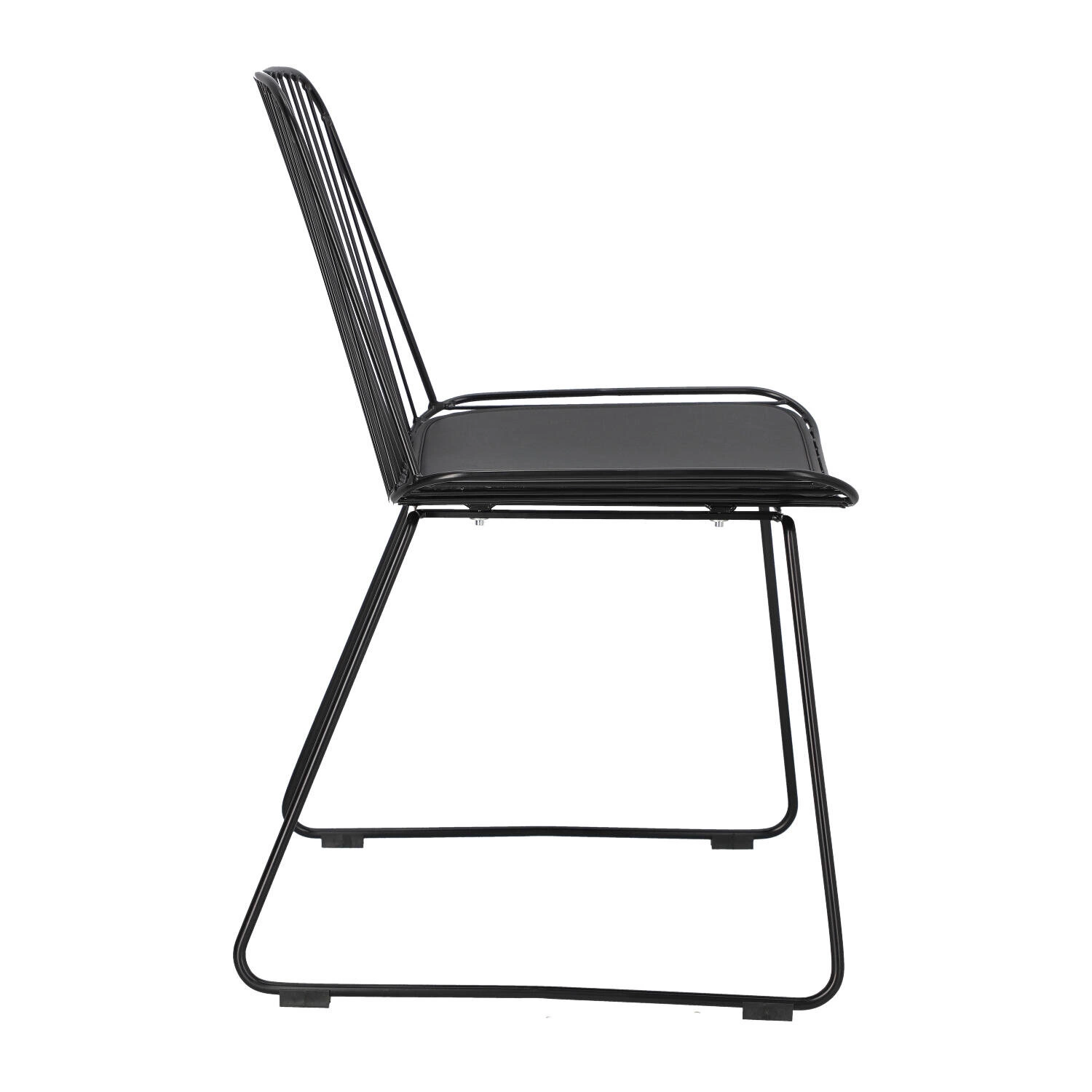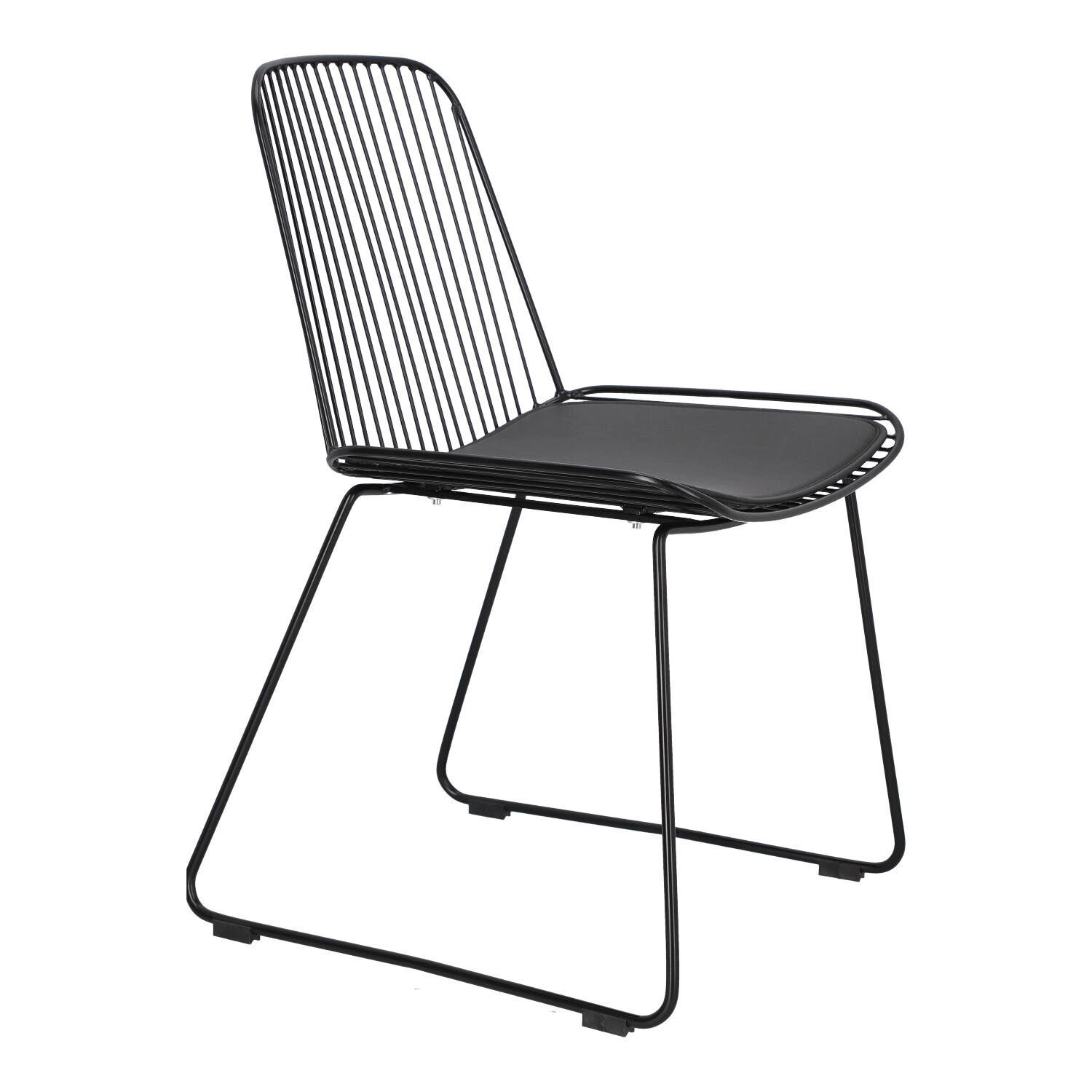Czarne loftowe krzesło Dill z poduszką z eko skóry to odważny projekt do nowoczesnego wnętrza. Zachwycające w swojej prostocie krzesło będzie nie tylko wygodnym siedziskiem, ale również ozdobą salonu lub jadalni. Krzesło o siedzisku oraz oparciu wykonanych z wielu cienkich przęseł jest nietypowym meblem. Podstawa krzesła to płozy zabezpieczone nakładką z tworzywa, która zapobiega rysowaniu się powietrzni pod krzesłem. Krzesło z metalu pomalowanego proszkowo na czarno utrzymane zostały w półmatowym wykończeniu. Poduszka na siedzisku jest zdejmowana. Cechy produktu: - odpryski farby na podstawie