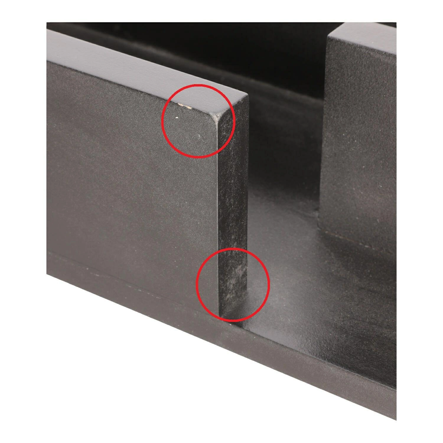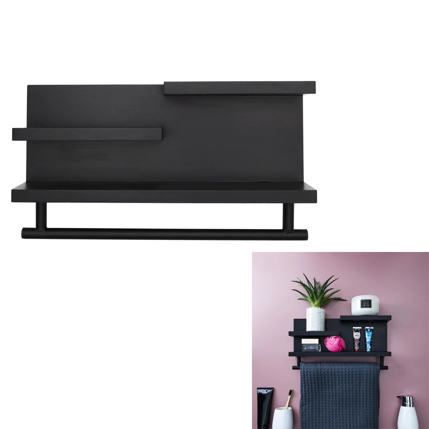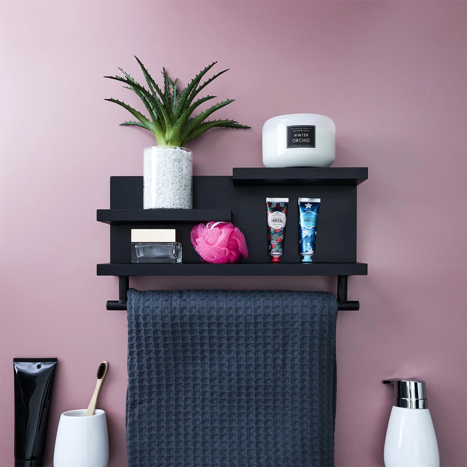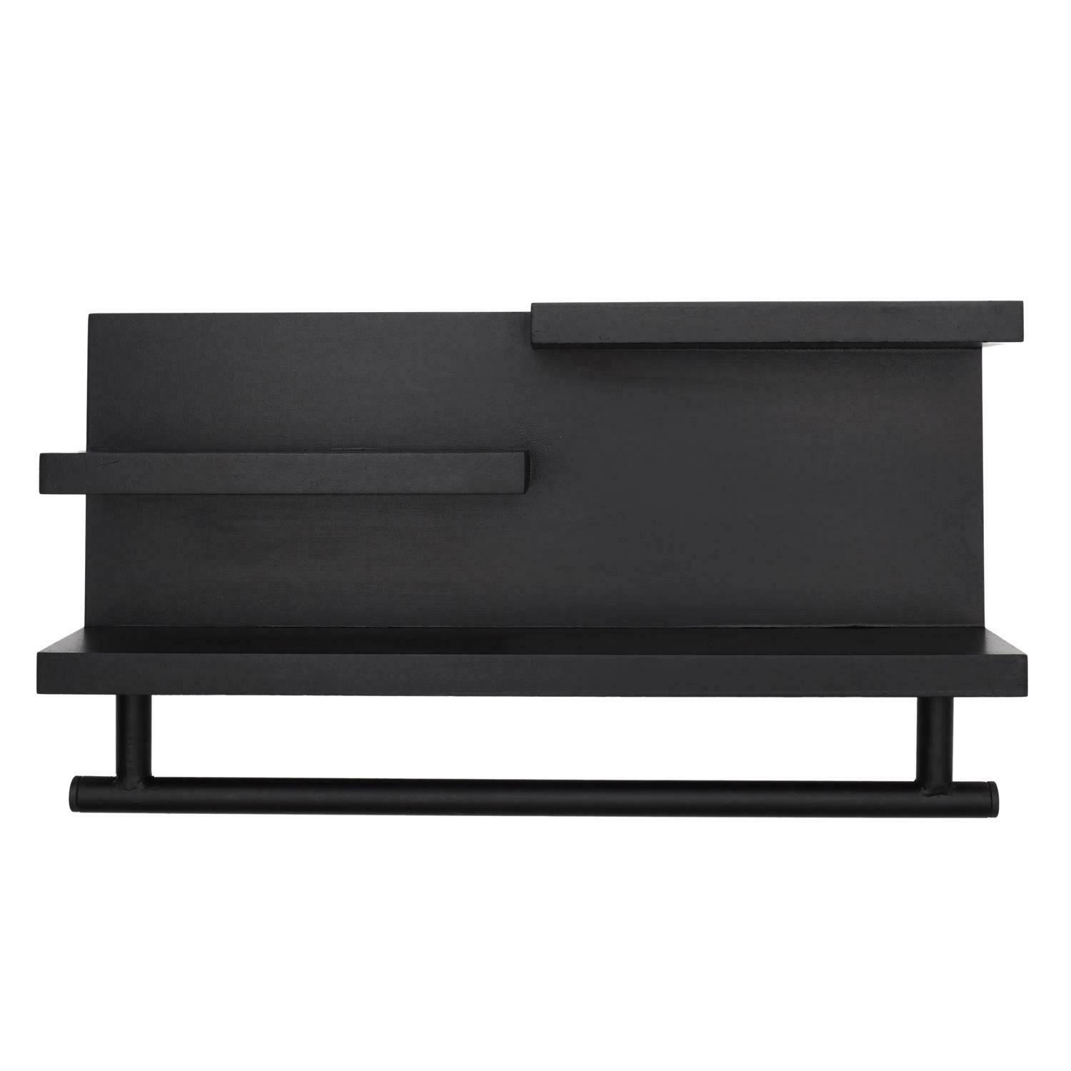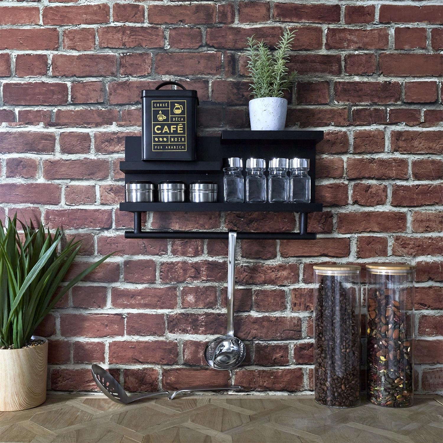 Półka Jimm z niezwykle wytrzymałego MDF i metalowym wspornikiem pod spodem to uniwersalna półka do zadań specjalnych. Półka Jimm sprawdzi się jako półka do łazienki. Posiada miejsce na butelki w stylu butelek na żel pod prysznic lub szampon, oraz metalowy wieszak, na którym śmiało możemy powiesić ręcznik lub myjkę. Półka Jimm to również półka do kuchni. Na półce możemy ustawić słoiczki z przyprawami, a na wieszaku metalowym możemy powiesić ścierkę. Czarna półka sprawdzi się zarówno w kuchni, łazience jak i przedpokoju. cechy produktu: -liczne zadrapania, odpryski farby.