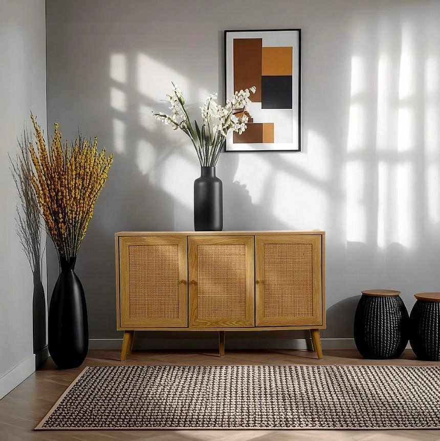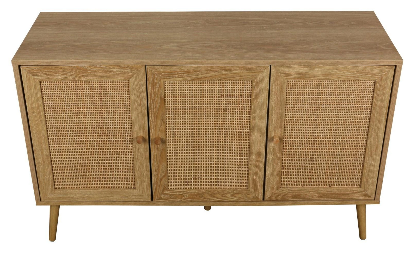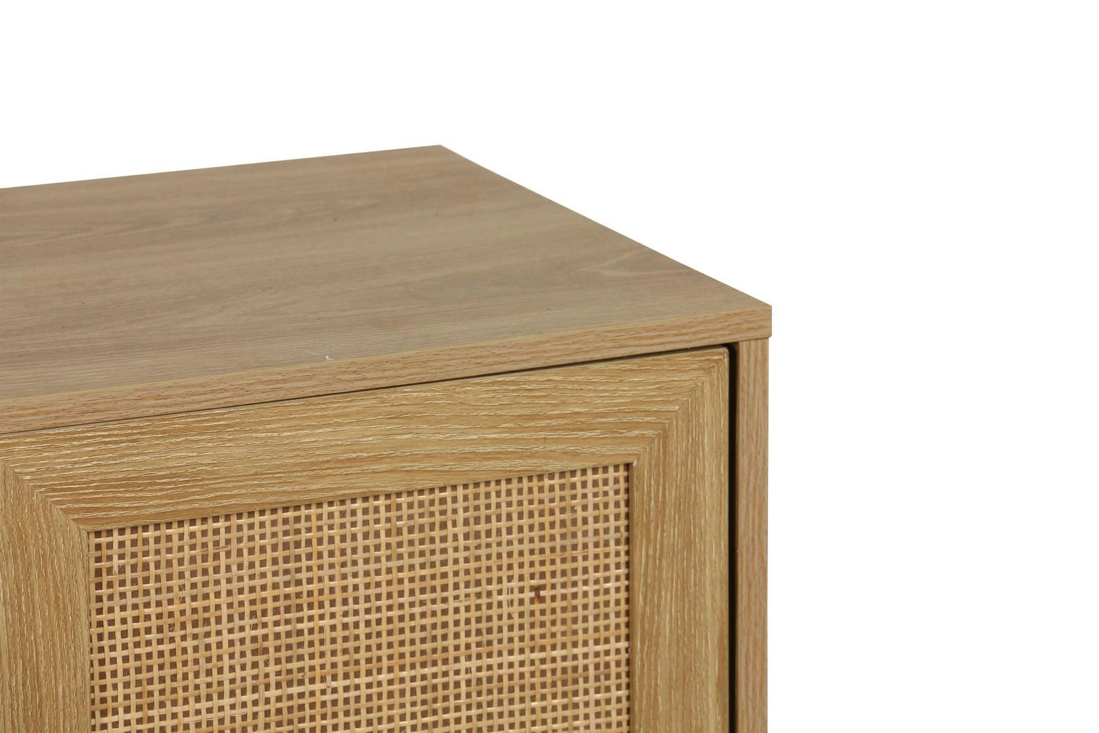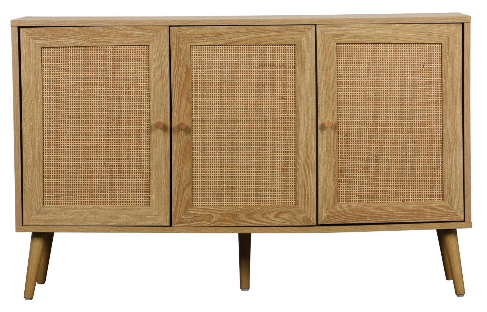 Komoda z 3 frontami z serii Ballo to nowoczesny mebel w naturalnym stylu boho. Minimalistyczna konstrukcja ozdobiona naturalnymi materiałami jak rattan czy lite drewno sprawdzi się we wnętrzu spójnym z naturalnymi kolorami. Jasna szafka o ciepłym odcieniu drewna idealnie sprawdzi się w beżowym wnętrzu. Materiał korpusu: płyta wiórowa laminowana papierowym laminatem imitującym naturalny kolor dębu. Nogi komody wykonane z litego drewna sosnowego. Rattanowa dekoracja frontów. Wymaga montażu. Maksymalne obciążenie mebla 50 kg.