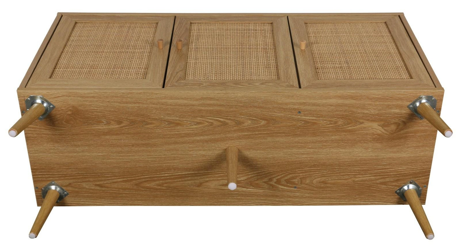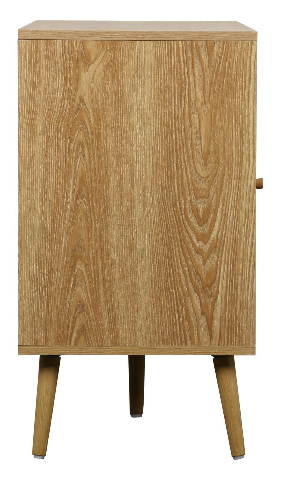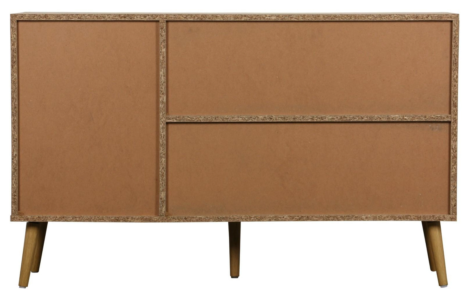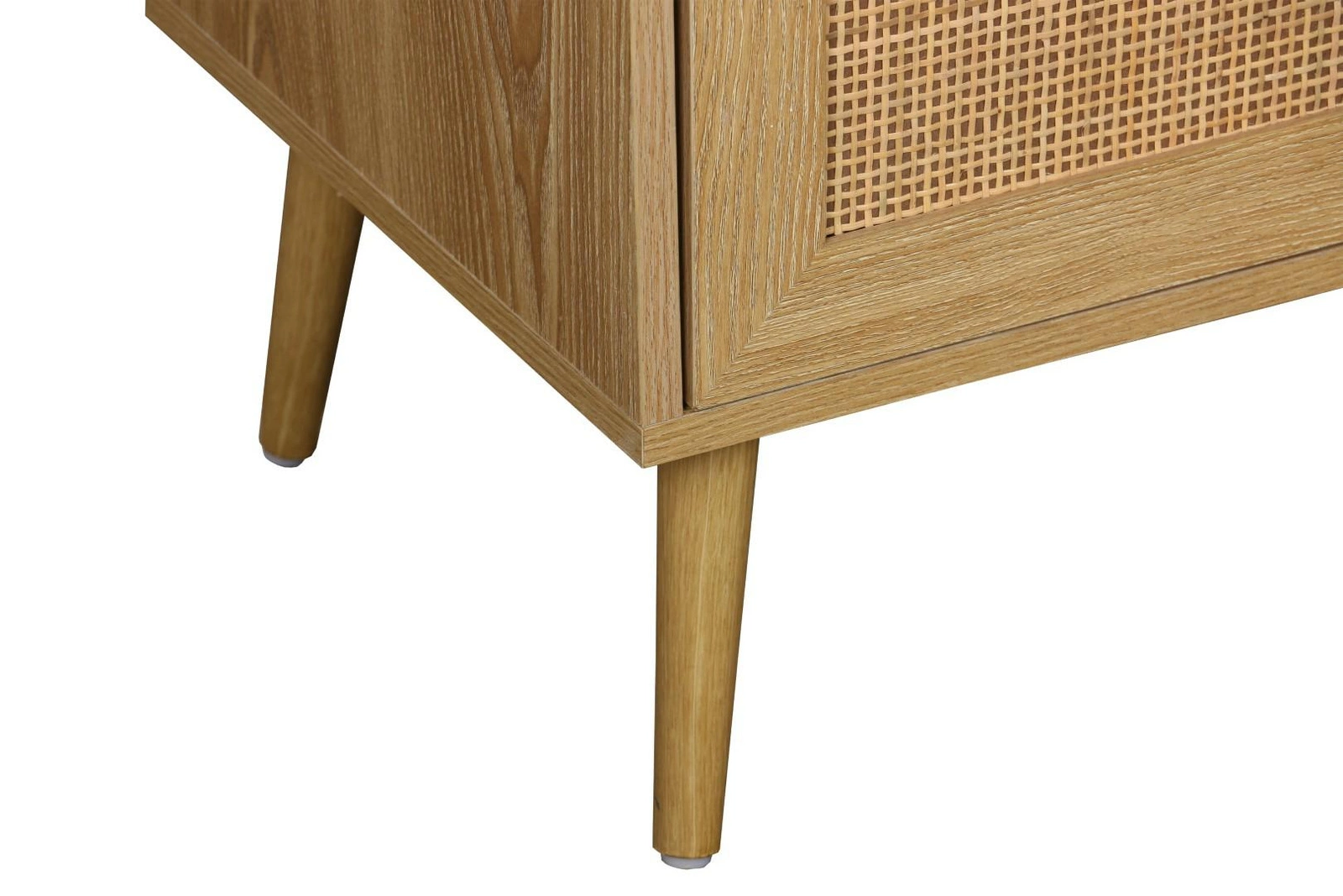 Komoda z 3 frontami z serii Ballo to nowoczesny mebel w naturalnym stylu boho. Minimalistyczna konstrukcja ozdobiona naturalnymi materiałami jak rattan czy lite drewno sprawdzi się we wnętrzu spójnym z naturalnymi kolorami. Jasna szafka o ciepłym odcieniu drewna idealnie sprawdzi się w beżowym wnętrzu. Materiał korpusu: płyta wiórowa laminowana papierowym laminatem imitującym naturalny kolor dębu. Nogi komody wykonane z litego drewna sosnowego. Rattanowa dekoracja frontów. Wymaga montażu. Maksymalne obciążenie mebla 50 kg.
