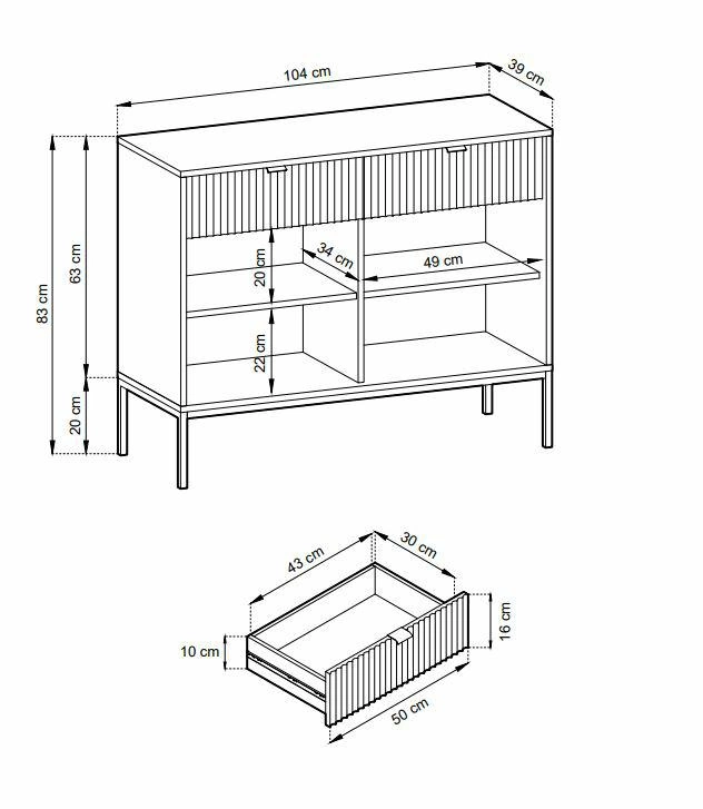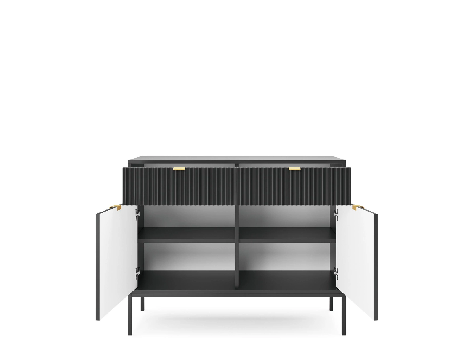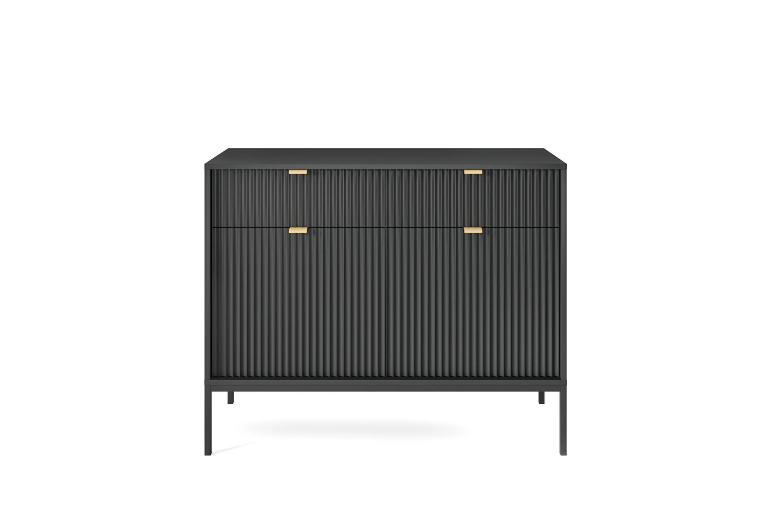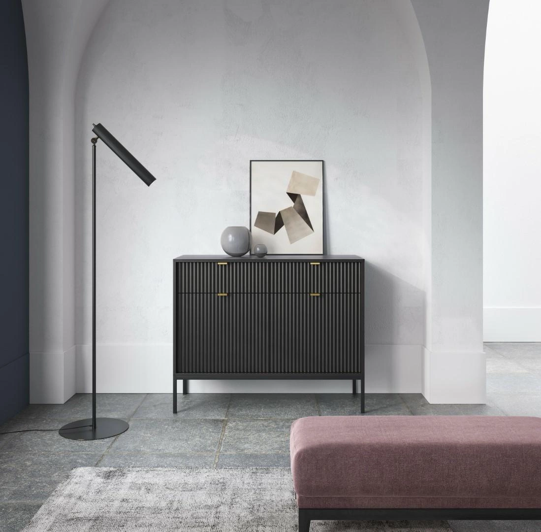 Komoda Delicious z ryflowanymi frontami ozdobi nasze wnętrze w nowoczesnym stylu i doda mu swoistego uroku. Ryflowane fronty komody podkreślają stylowe, aluminiowe uchwyty w kolorze złotym. Pojemna komoda o głębokości 39 cm pozwoli na uporządkowanie nie tylko odzieży, ale również innych przedmiotów jak sztućce, pamiątki rodzinne czy elektronikę. Podstawą komody są metalowe, stabilne nogi. Komoda na wysokich nogach jest wygodnym meblem, gdyż łatwo jest pod nią odkurzyć oraz wytrzeć podłogę. Cienkie eleganckie nogi dodają jej również wizualnej lekkości, która jest bardzo ważna w niedużych pomie